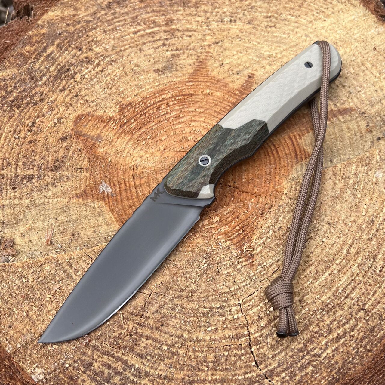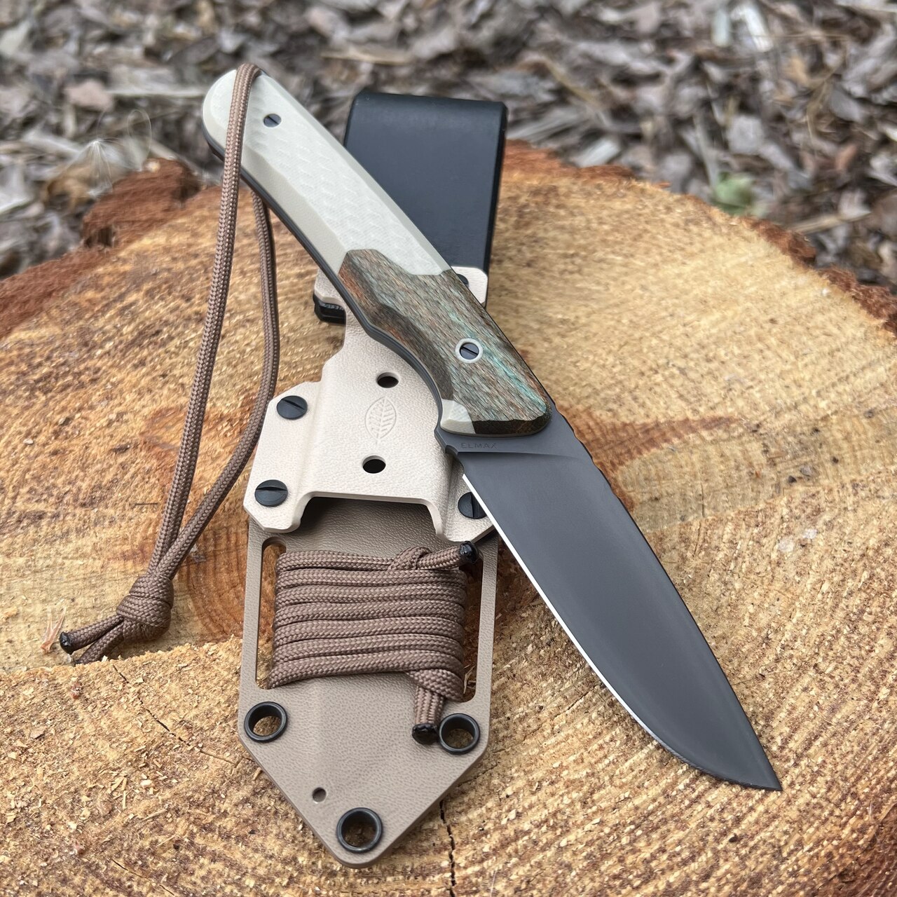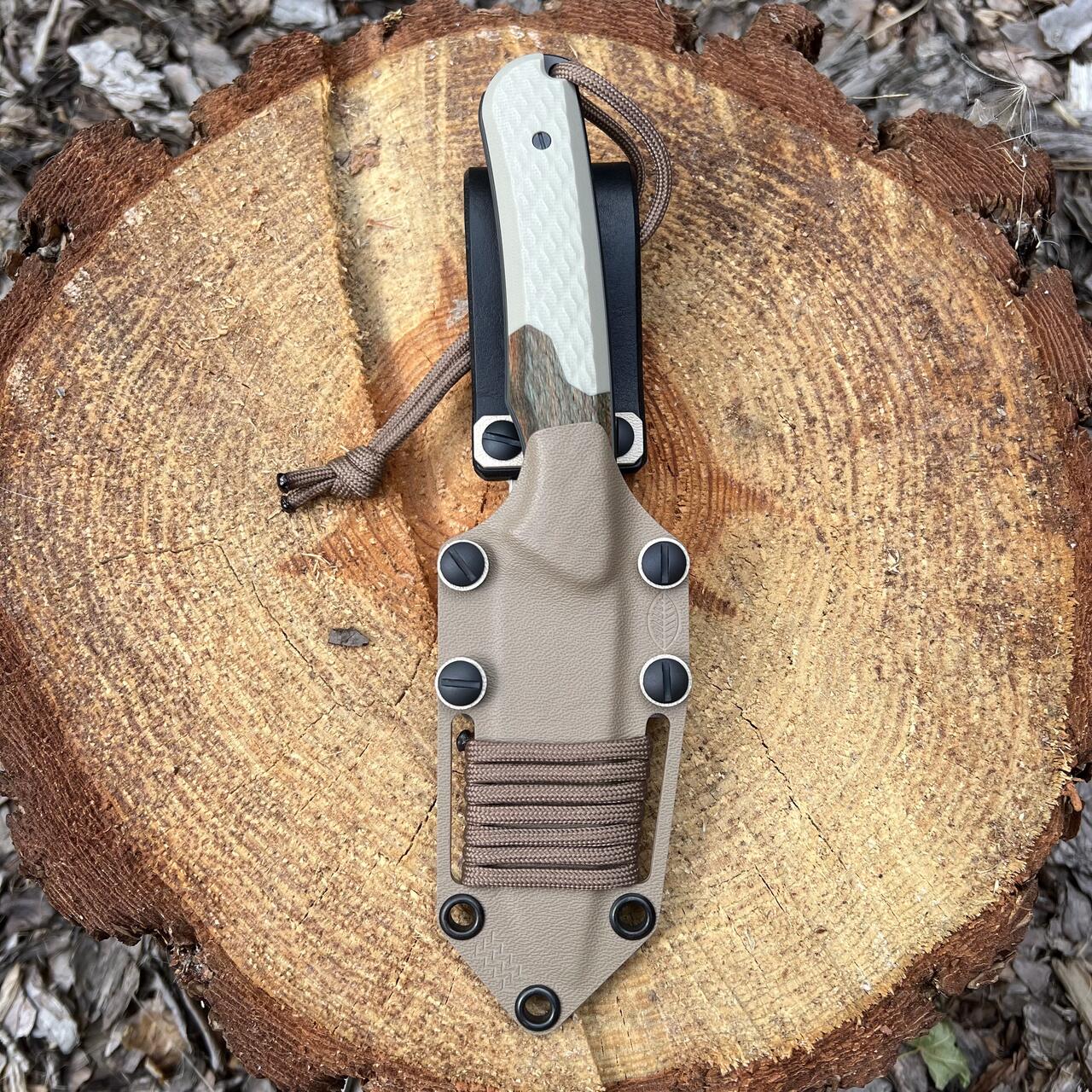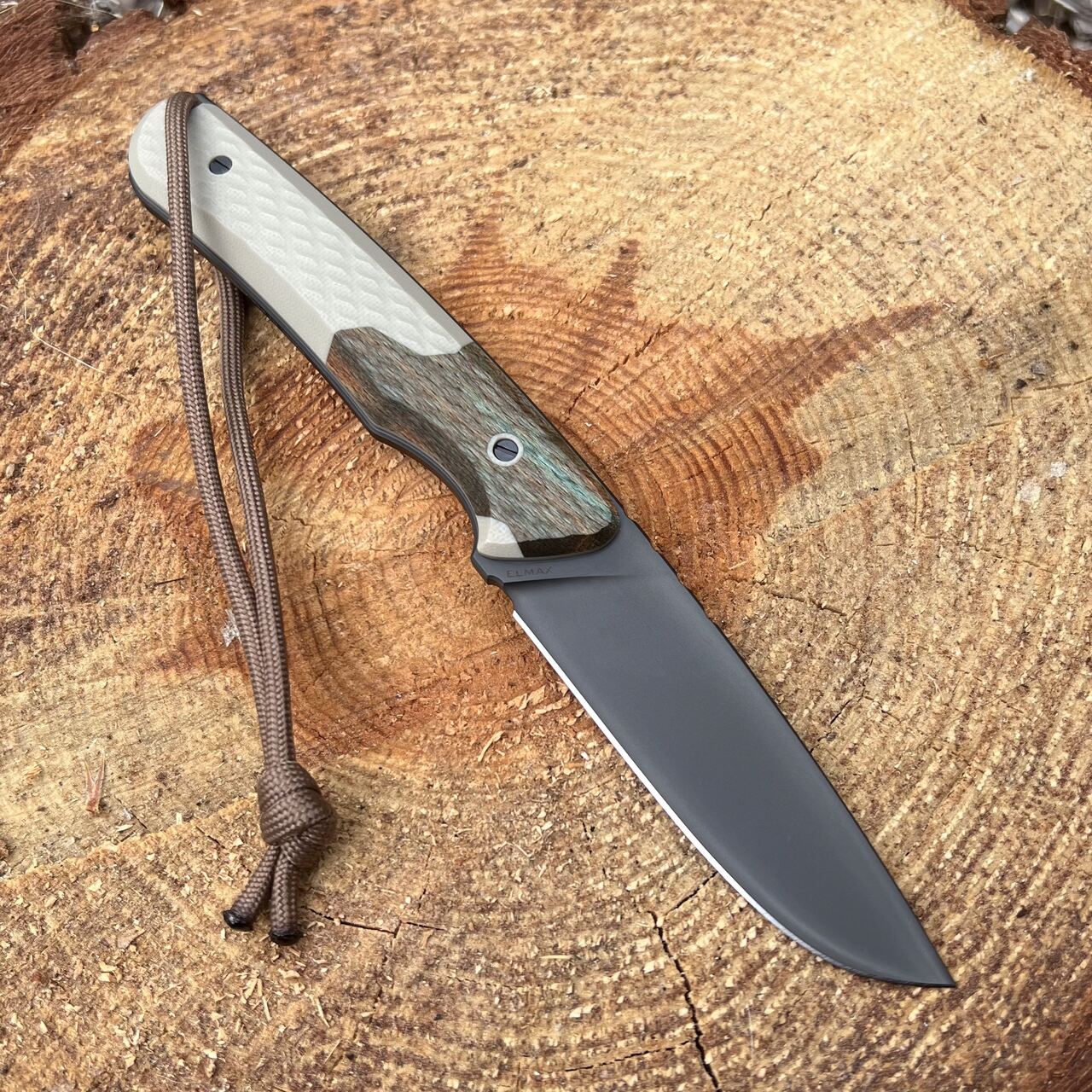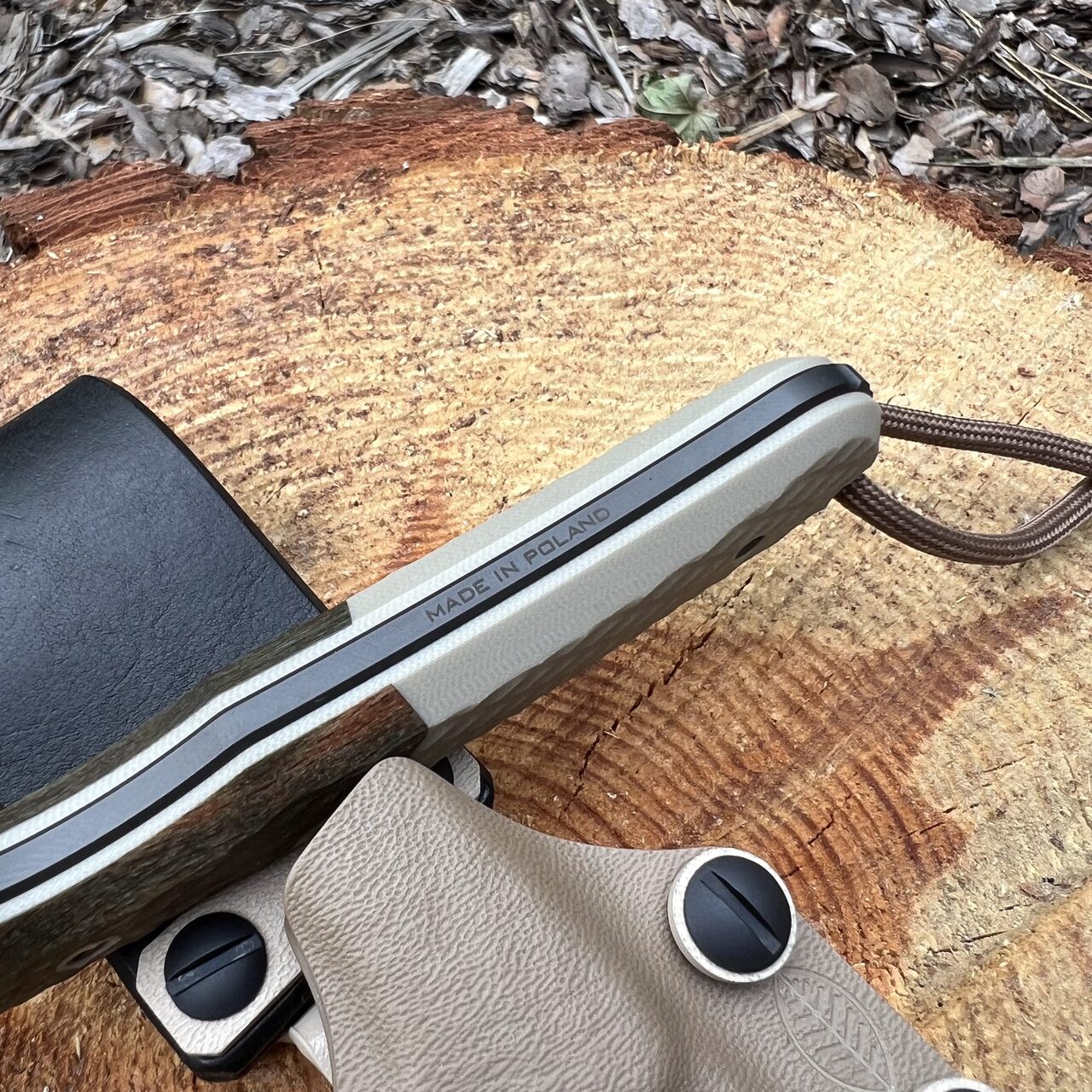 - Rękojeść: kompozyt G10 Desert Tan + drewno stabilizowane (orzech włoski)