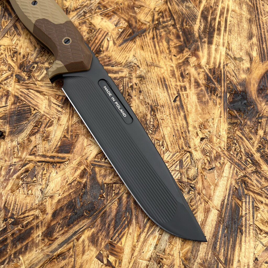 - Ostrze:stałe (full tang), profil drop point ze szlifem rowkowym, szlif płaski na sztychu, obustronne zbrocze (fuller), gładka krawędź tnąca