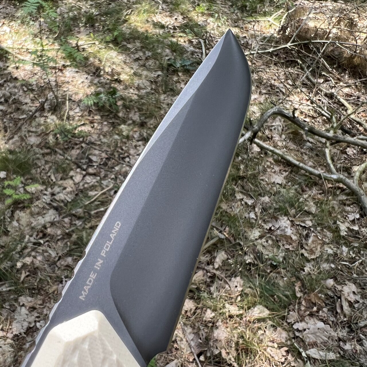 - Ostrze: stałe (full tang), profil drop point ze szlifem płaskim, gładka krawędź tnąca