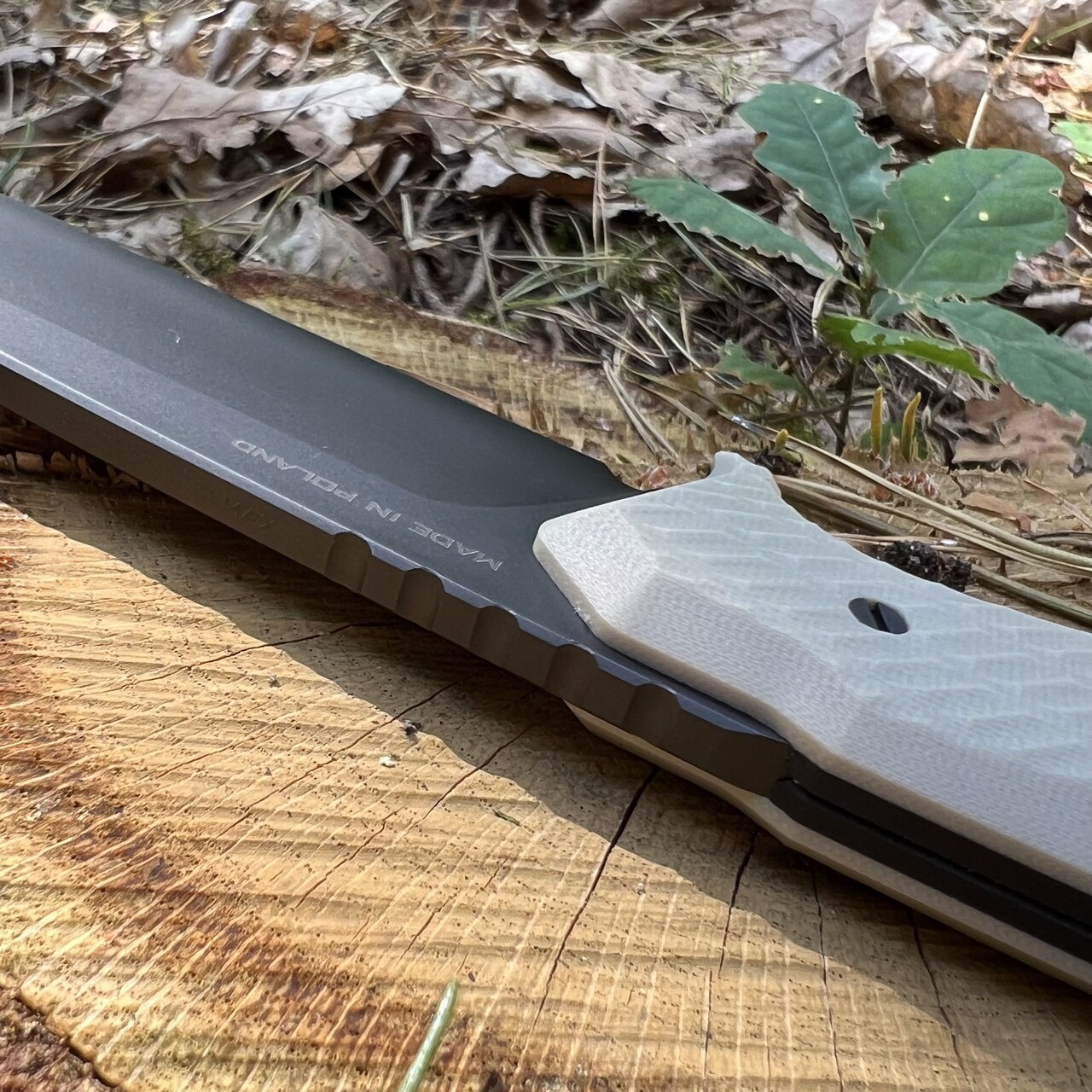 Nóż MK Knives & Tools „Tan” posiada ostrze z doskonałej stali Elmax ze szlifem płaskim. Głownię pokryto czarną powłoką DLC. Okładki rękojeści wykonane z kompozytu G10 (połączenie kolorów Desert Tan i czarnego) kryją na jej zakończeniu pin na paracord czy linkę itd. W komplecie z nożem otrzymujemy czarną kaburę z Kydexu.