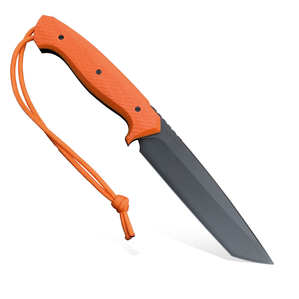 Okładziny rękojeści o zowalizowanym kształcie wykonane zostały z bardzo wytrzymałego kompozytu G10 (połączenie materiałów o kolorach pomarańczowym i czarnym). G10 jest odporny na wilgoć, zmiany temperatury, większość rozpuszczalników i kwasów, posiadają wysoką odporność na uszkodzenia mechaniczne. W prezentowanym nożu materiał okładek posiada chropowaty wzór zapobiegający ślizganiu się rękojeści w dłoni. Okładki rękojeści zostały skręcone czarnymi stalowymi śrubami w powłoce PVD. Śruby dopełniają design noża, elegancko komponując się z czarnym ostrzem. Rękojeść została zaopatrzona w jelec z kompozytu G10 zapobiegający ześlizgnięciu się dłoni na ostrze. Jelec powstał z wyprofilowania okładzin rękojeści.