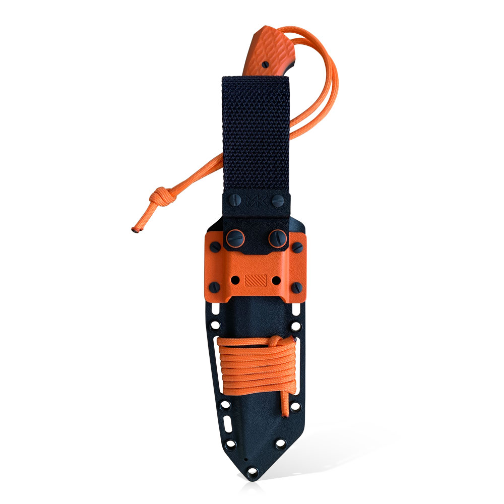 Kaburę do paska mocujemy za sprawą grubej nylonowej szlufki. Kabura ma możliwość montażu do rozwiązań typu MOLLE za sprawą dołączonej do zestawu, specjalnie zaprojektowanej na ten cel klamry z kydexu (klamrę mocujemy w miejsce odpiętej wcześniej nylonowej szlufki). Nóż i kaburę można dodatkowo ustabilizować lub zabezpieczyć paracorderm przeplatając go przez zaprojektowane w kaburze otwory. Można do tego oczywiście użyć zapasu paracordu, którym opleciona jest kabura (jego barwa odpowiada odcinkowi znajdującemu się przy nożu).NAZWA: Sentinel „Inevitable”