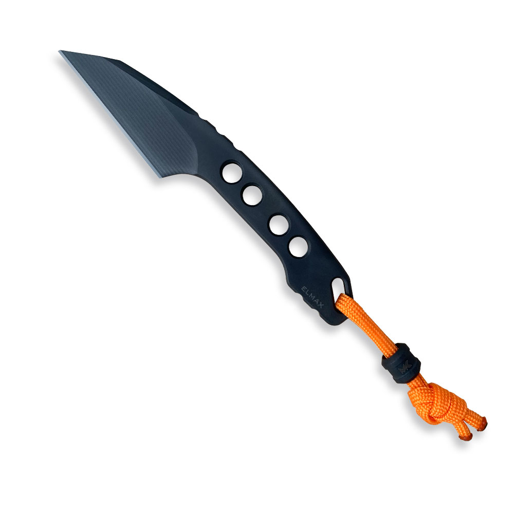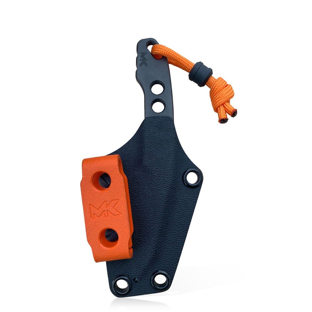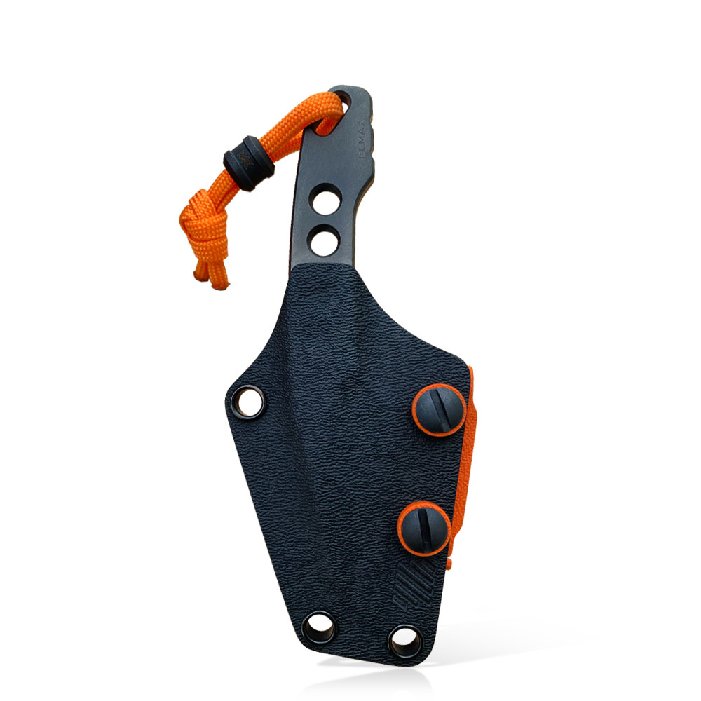 Niewielkie rozmiary, ale duże możliwości! Skuteczne ostrze typu wharncliffe ze świetnej stali Elmax oraz czarnej powłoce DLC (twardośc ok. 90 HRC). Do tego dwukolorowa – łącząca czerń i pomarańcz kabura z kydexu. Kabura posiada możliwość przenoszenia przy pasku w pionie lub w poziomie, oraz z opcję przenoszenia na szyi (nóż typu neck). Zgrabna całość zamknięta w pięknym projekcie, wykonana w niezwykłym, drobiazgowym stylu MK Knives & Tools.