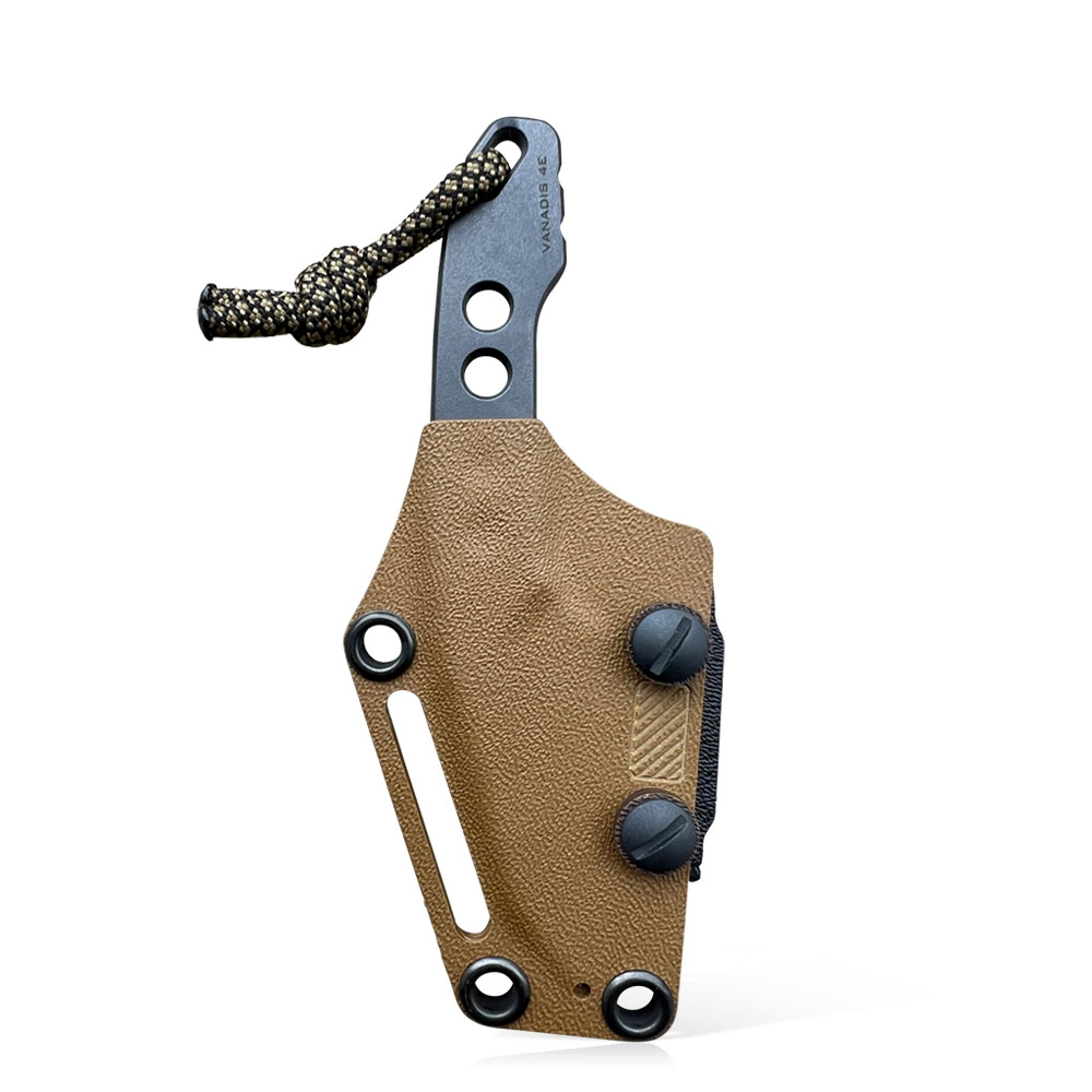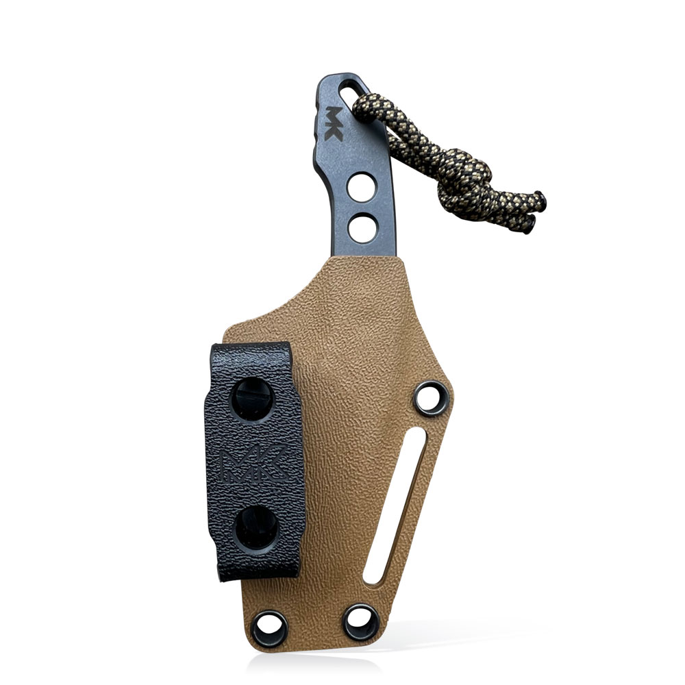 Nóż MK Knives & Tools Spike „Coyote” | Vanadis 4 Extra | PVD posiada ostrze wyprowadzone innowacyjnym szlifem wklęsłym (charakterystyczne rowki na ostrzu), kaburę z tworzywa kydex w kolorze coyote z klamrą w kolorze czarnym kompatybilną z rozwiązaniami typu Molle.
