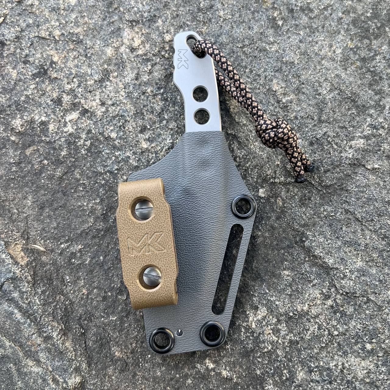 Nóż MK Knives & Tools Spike „Grey-Coyote” posiada ostrze wyprowadzone innowacyjnym szlifem wklęsłym (charakterystyczne rowki na ostrzu), kaburę z tworzywa Kydex w kolorze szarym z klamrą w kolorze coyote kompatybilną z rozwiązaniami typu Molle.