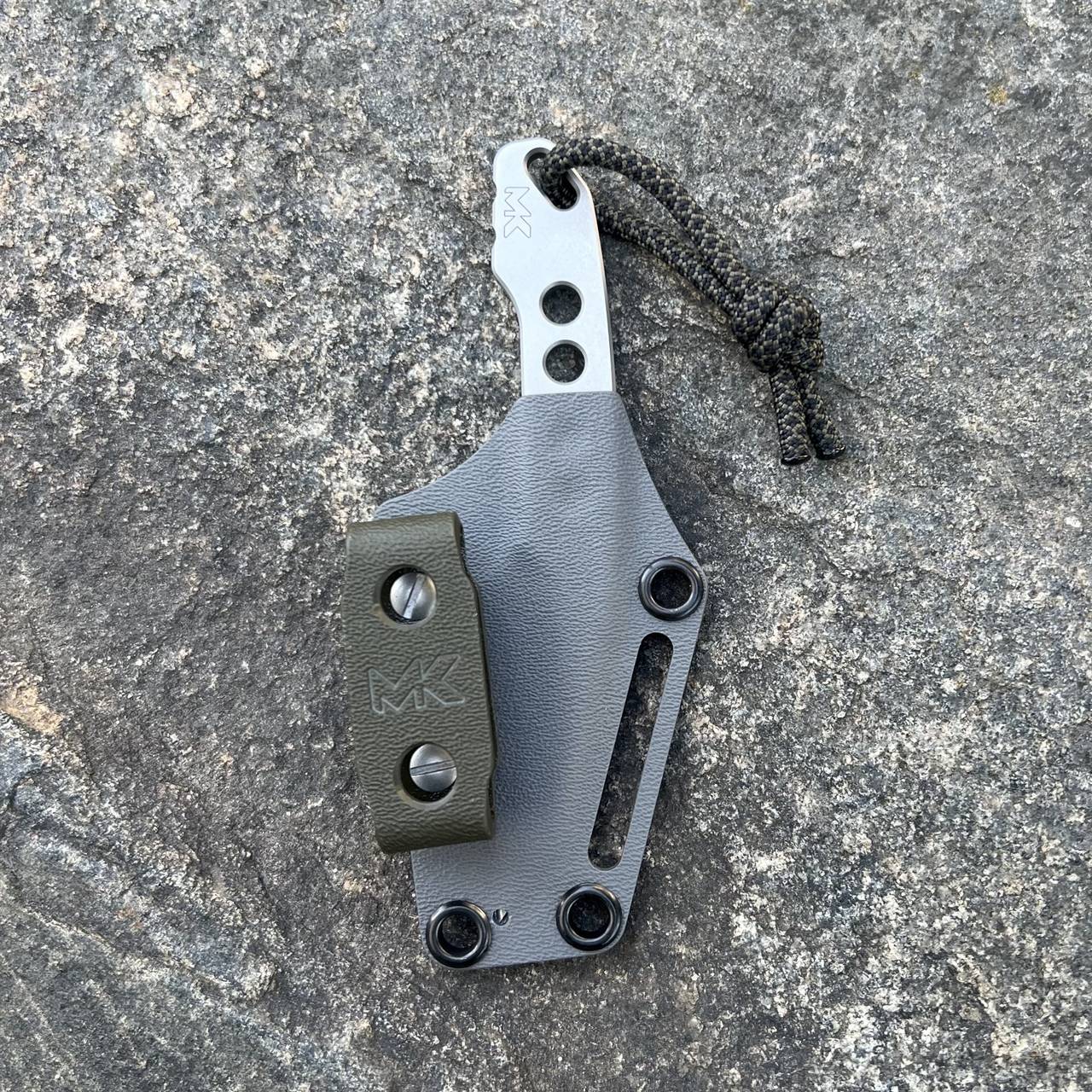Nóż MK Knives & Tools Spike „Grey-Olive” posiada ostrze wyprowadzone innowacyjnym szlifem wklęsłym (charakterystyczne rowki na ostrzu), kaburę z tworzywa Kydex w kolorze szarym z klamrą w kolorze olive kompatybilną z rozwiązaniami typu Molle.