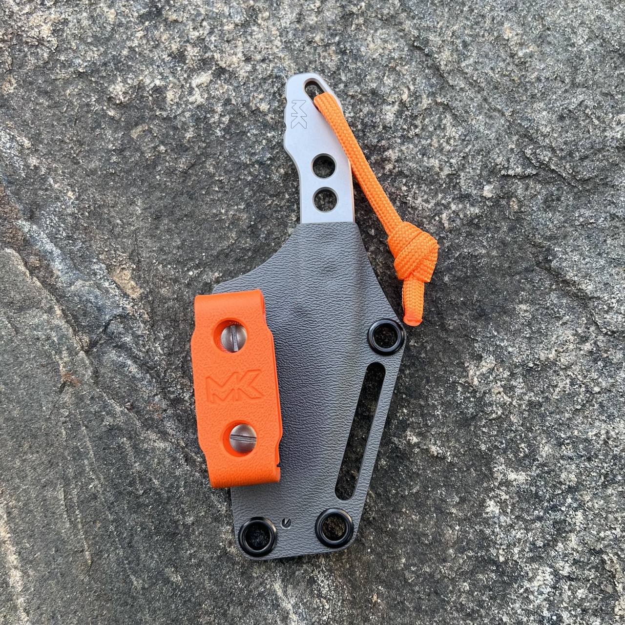 Nóż MK Knives & Tools Spike „Grey-Orange” posiada ostrze wyprowadzone innowacyjnym szlifem wklęsłym (charakterystyczne rowki na ostrzu), kaburę z tworzywa Kydex w kolorze szarym z klamrą w kolorze pomarańczowym kompatybilną z rozwiązaniami typu Molle.