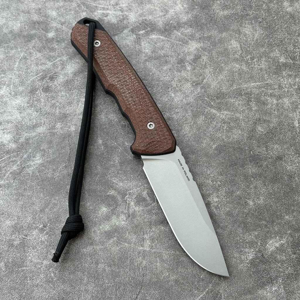 - Rękojeść: Customowa Micarta i przekładki (liners) z czarnego G10