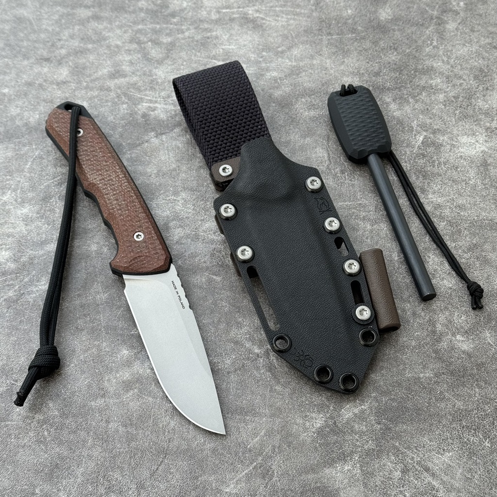 - Pokrowiec: Czarna kabura Kydex wraz z uchwytem na krzesiwo