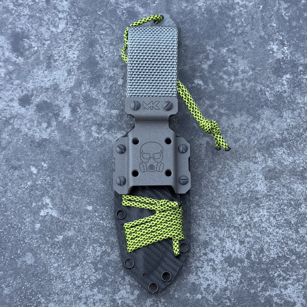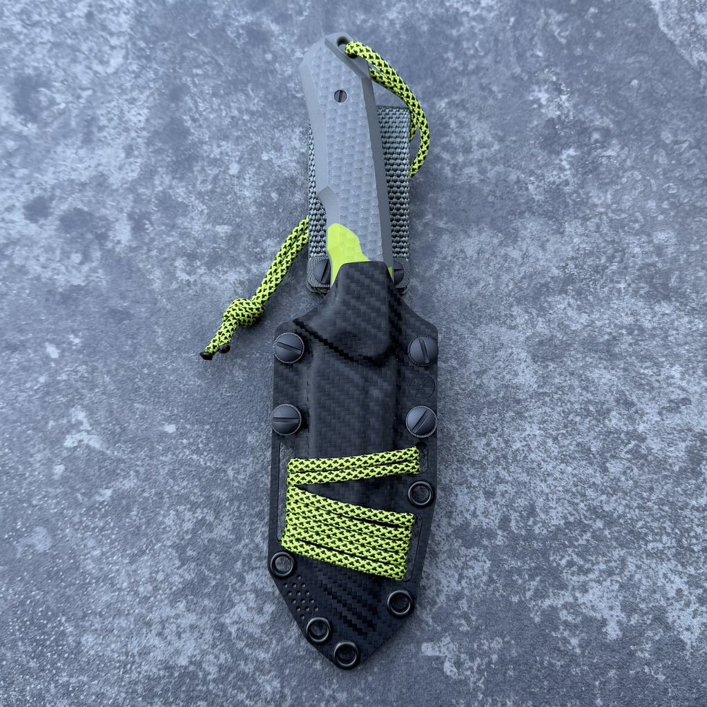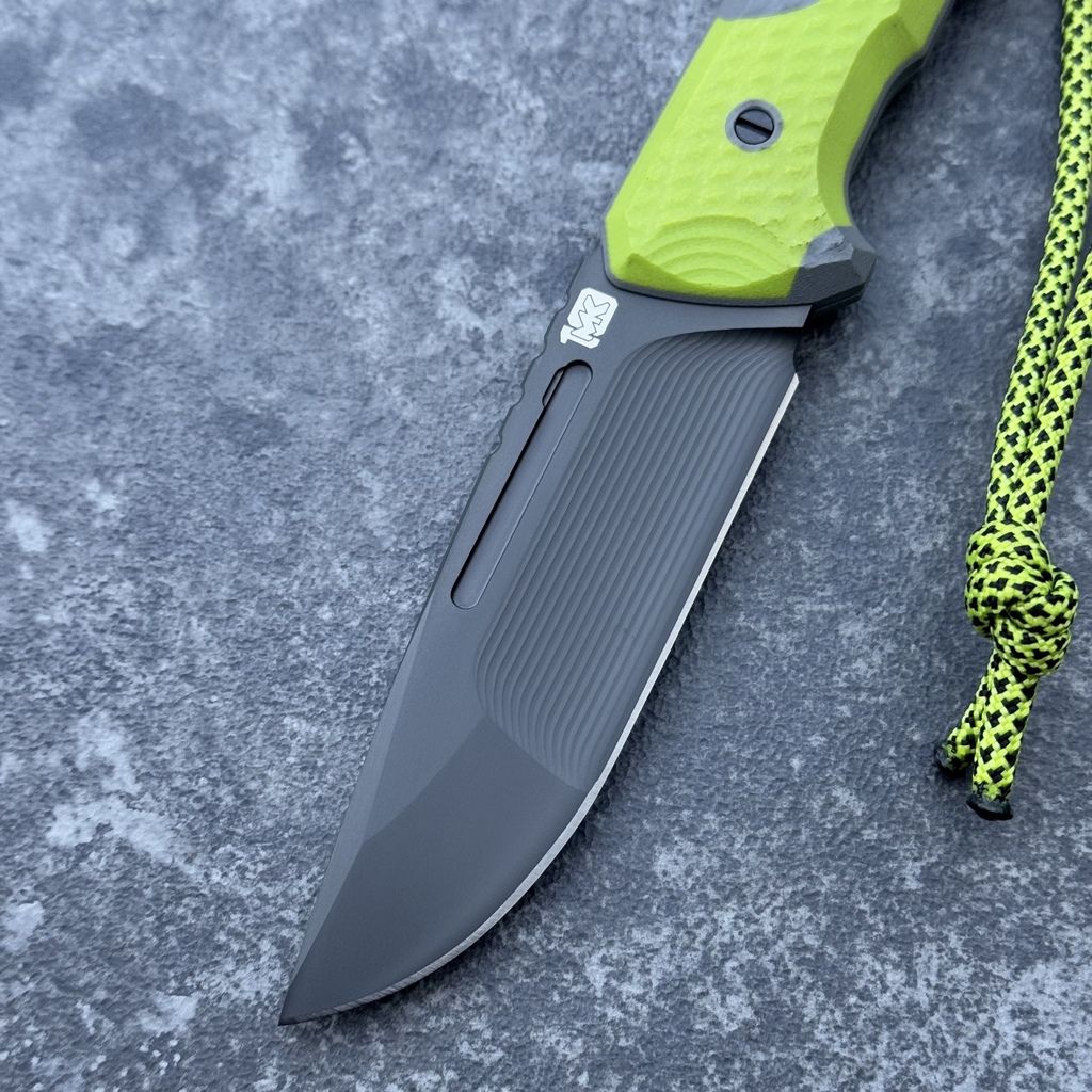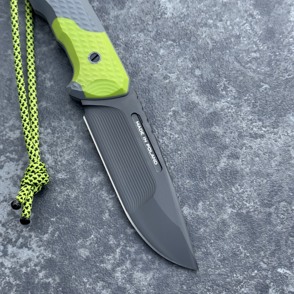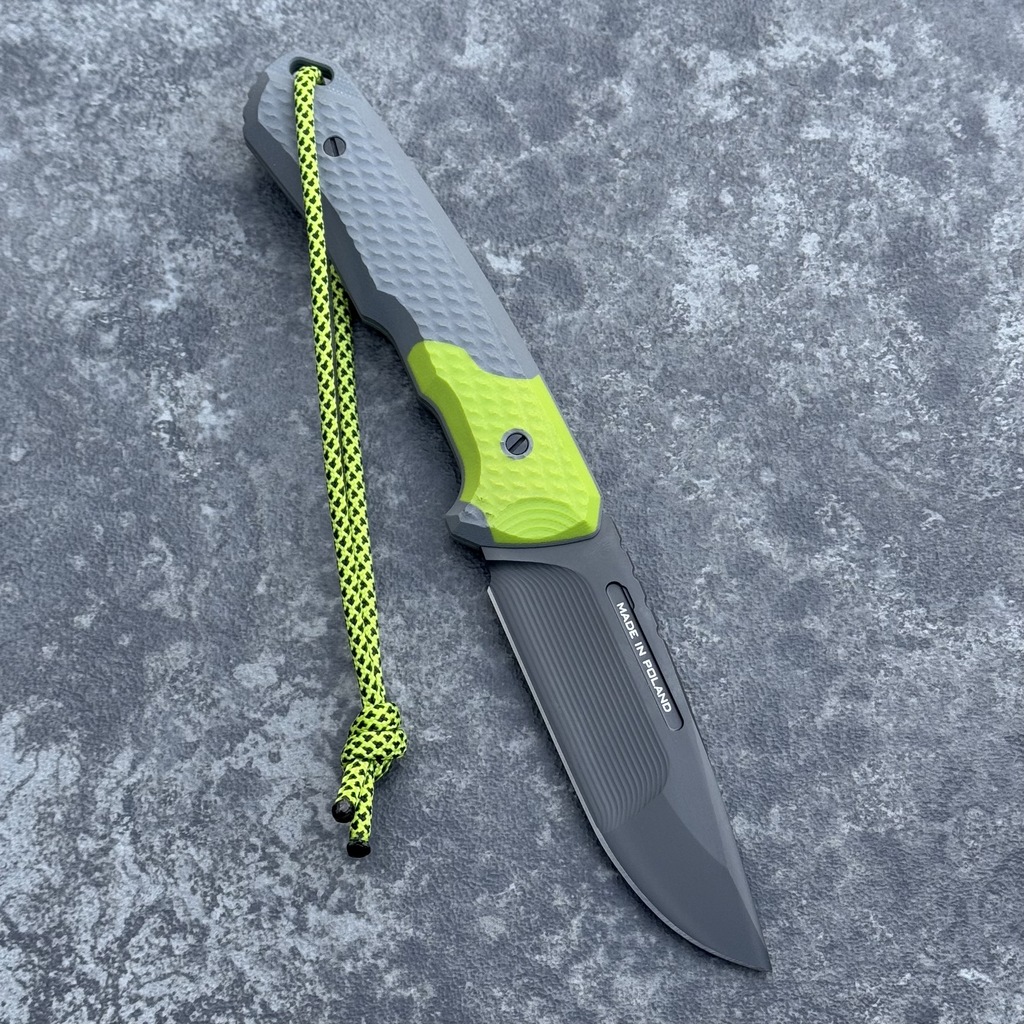 - Rękojeść: Szary laminat G10 (Charcoal Grey) + wstawki z jaskrawo-zielonego G10 (Toxic Green G10)