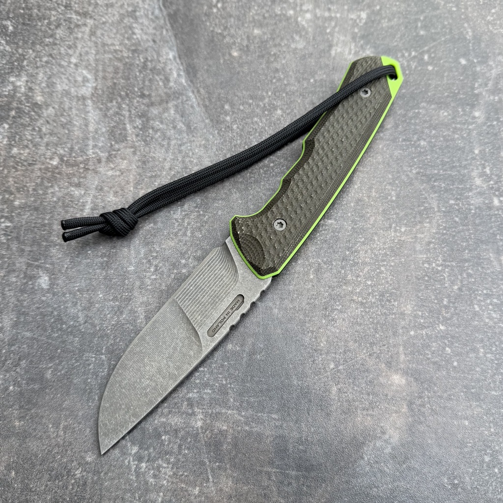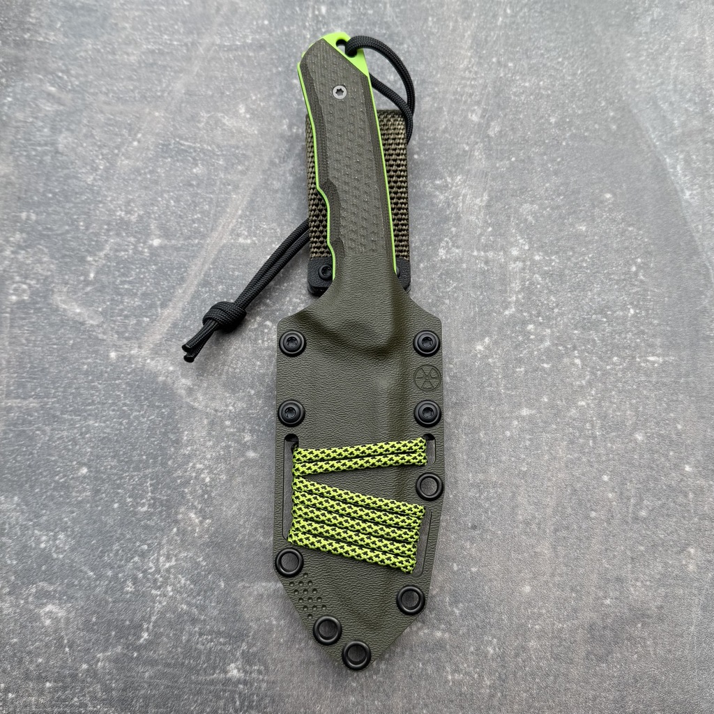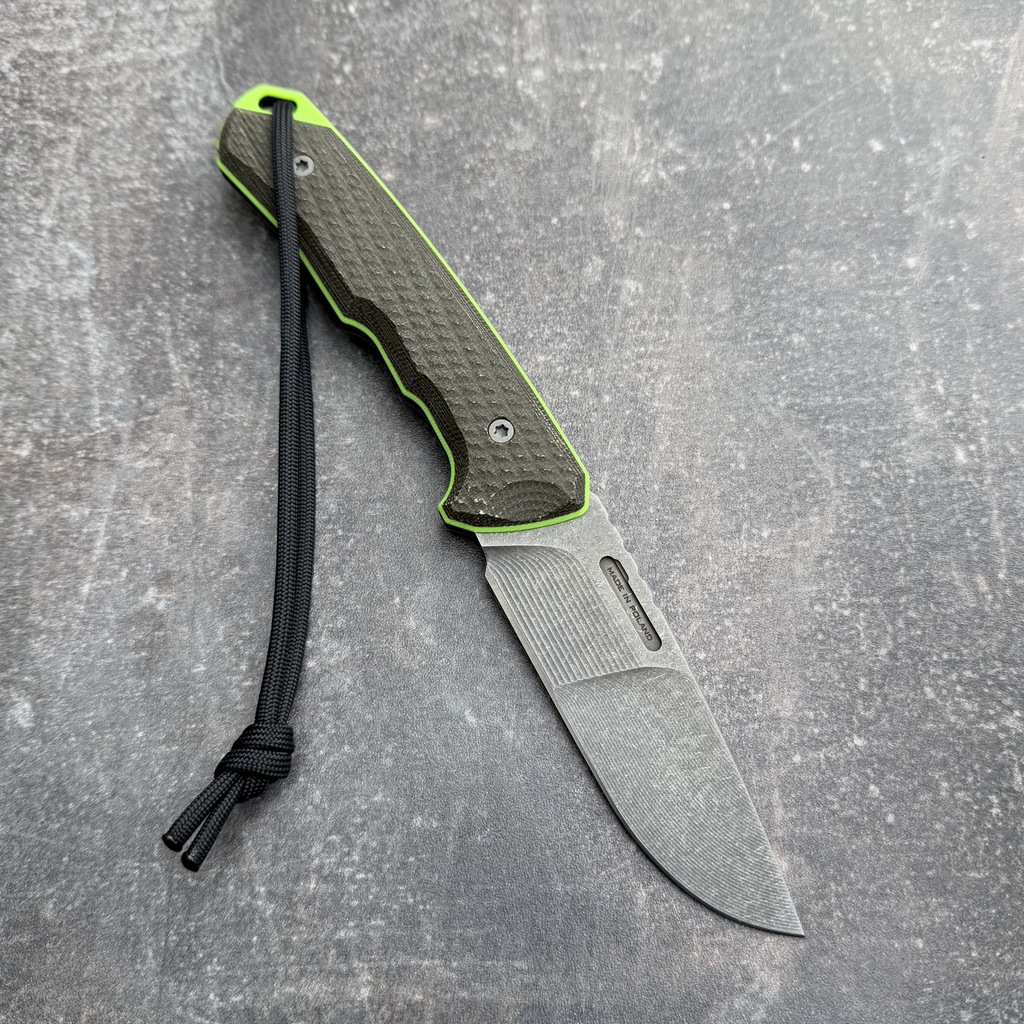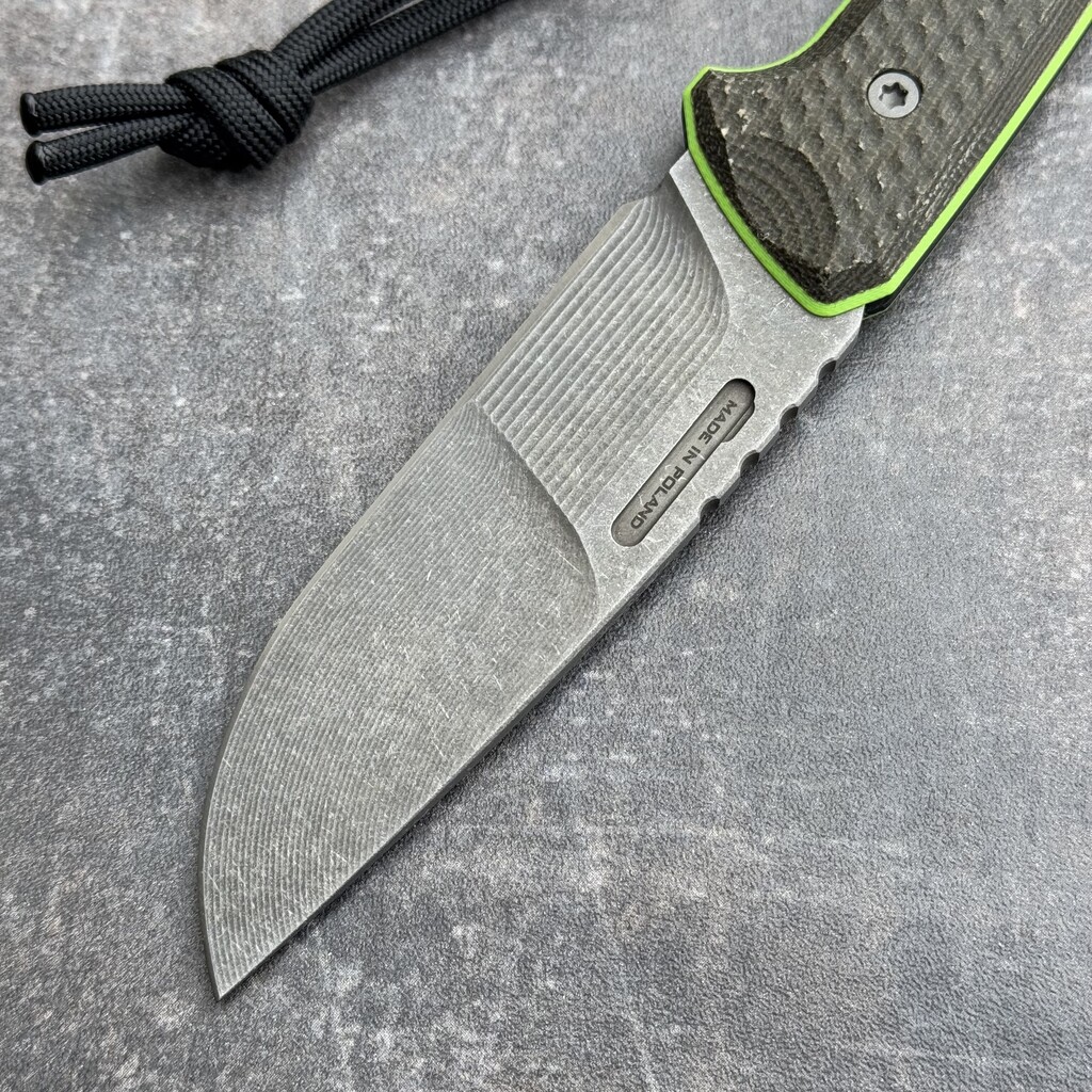 - Rękojeść: Zielona Micarta (Green Canvas Micarta) i jaskrawozielony laminat G10 (Toxic Green G10)