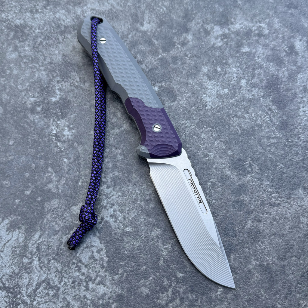- Rękojeść: szary laminat G10 (Charcoal Grey) + fioletowymi wstawki (Royal Purple inserts)