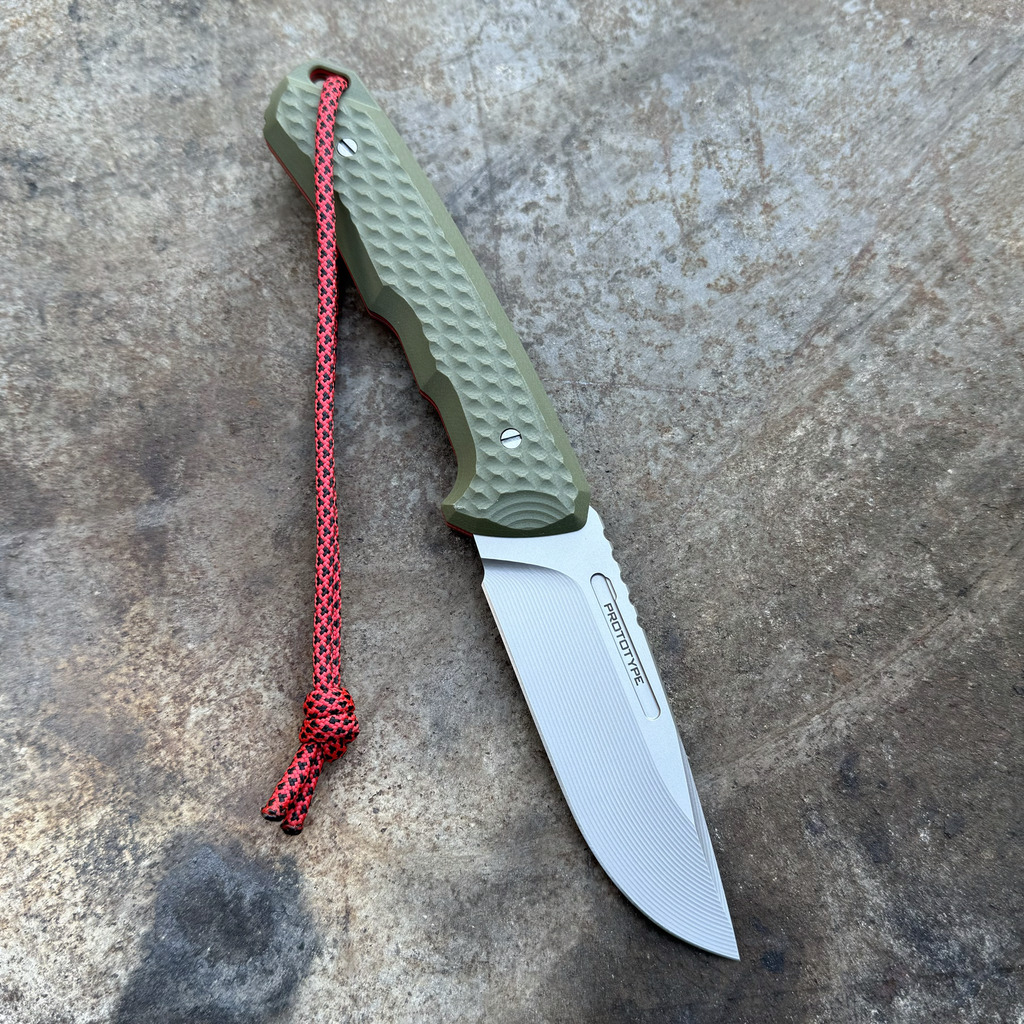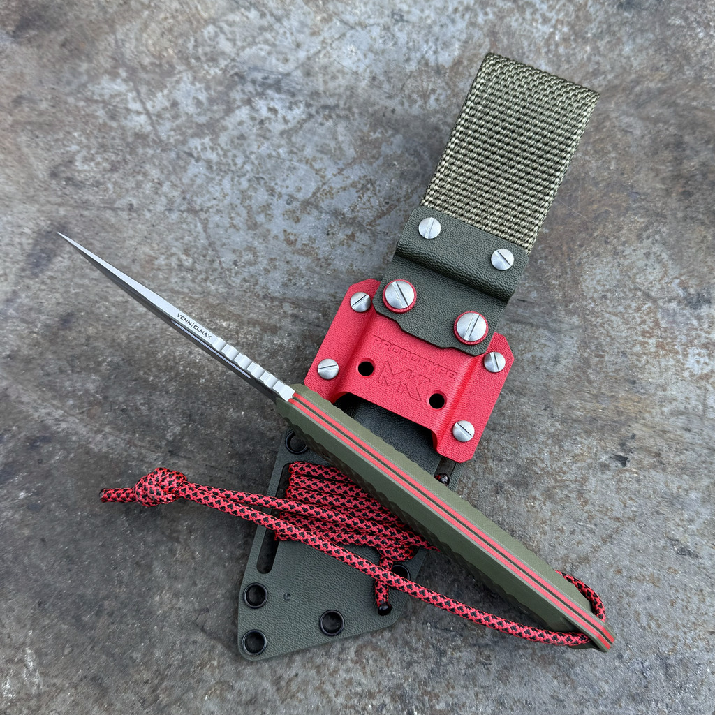 Nóż MK Knives & Tools Venn PROTOTYPE 10th Anniversary Logo Glass Blasted Elmax Olive G10/Red Liners Olive Kydex
