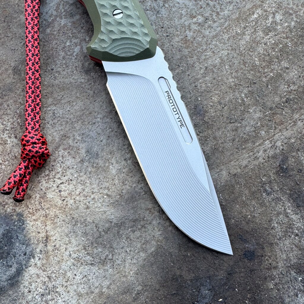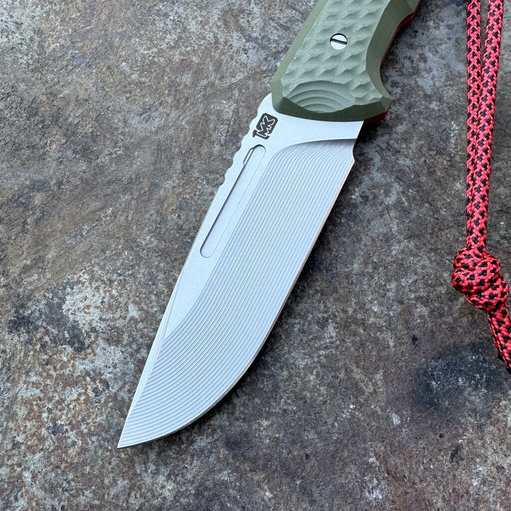 - Ostrze: stałe (hidden tang), profil drop point ze szlifem rowkowym (Groove Grind / wklęsły), obustronne zbrocze (fuller), gładka krawędź tnąca