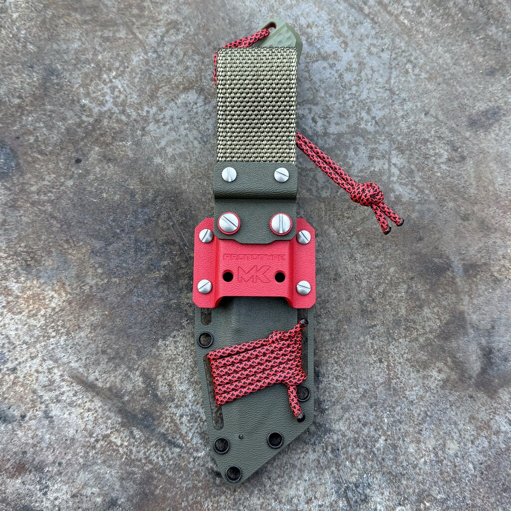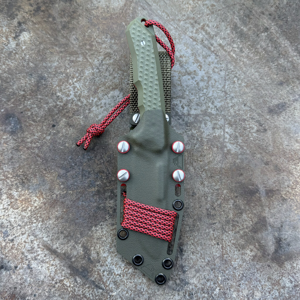- Pokrowiec: oliwkowa kabura Kydex (OD Green) i czerwone dodatki kolorystyczne