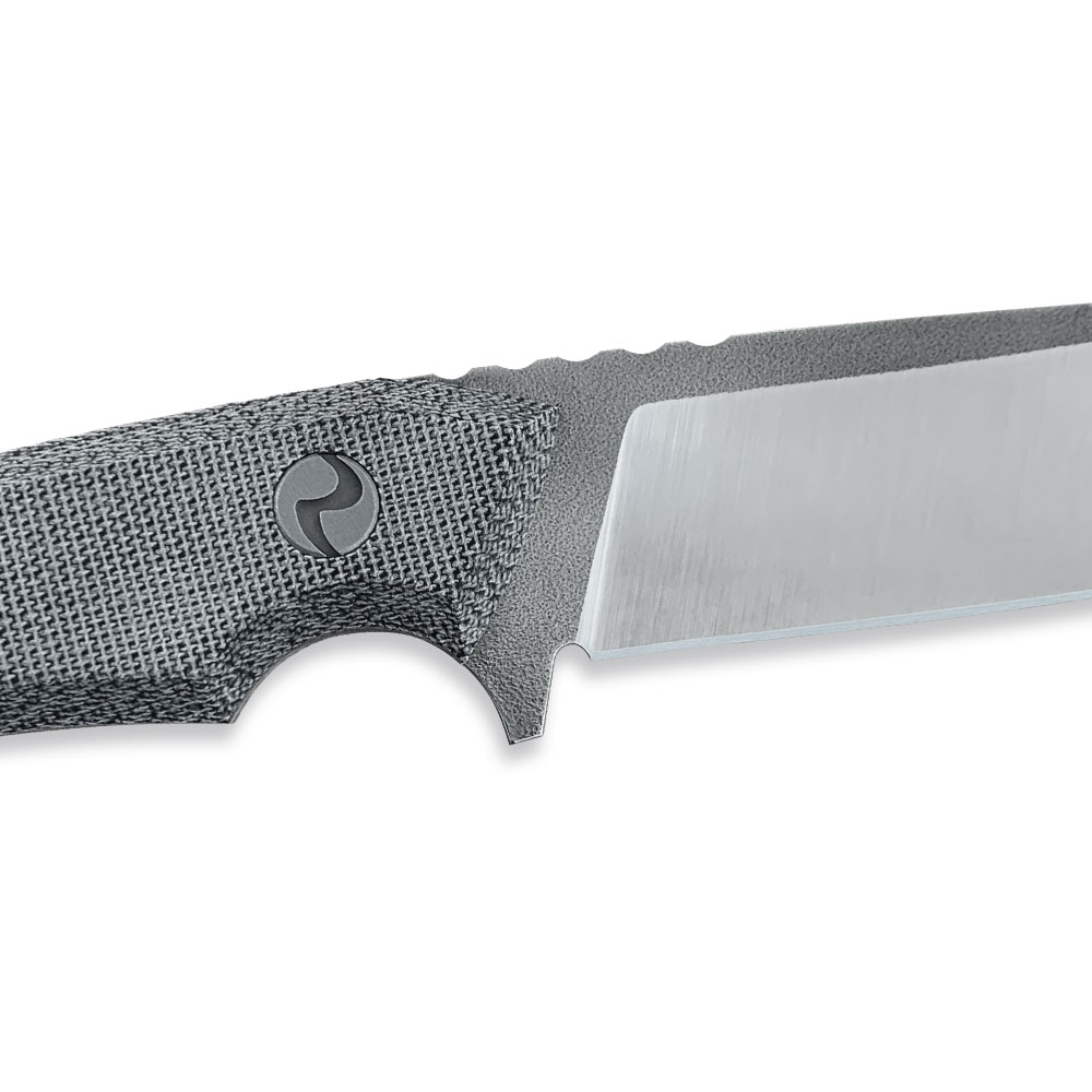 Okładziny rękojeści wykonane zostały z czarnego laminatu Canvas Micarta odpornego na wilgoć, zmiany temperatury, większość rozpuszczalników i kwasów, posiadającego wysoką odporność na uszkodzenia mechaniczne. Micarta znana ze swoich doskonałych właściwości, również wizualnych (daje się stylizować na naturalny materiał) ma antypoślizgową, chropowatą strukturę. Okładziny zostały przyklejone i przykręcone wypiaskowanymi nierdzewnymi śrubami. Śruby stanowią dość charakterystyczny detal noża, przez wzgląd na autorski wzór na nich się znajdujący.