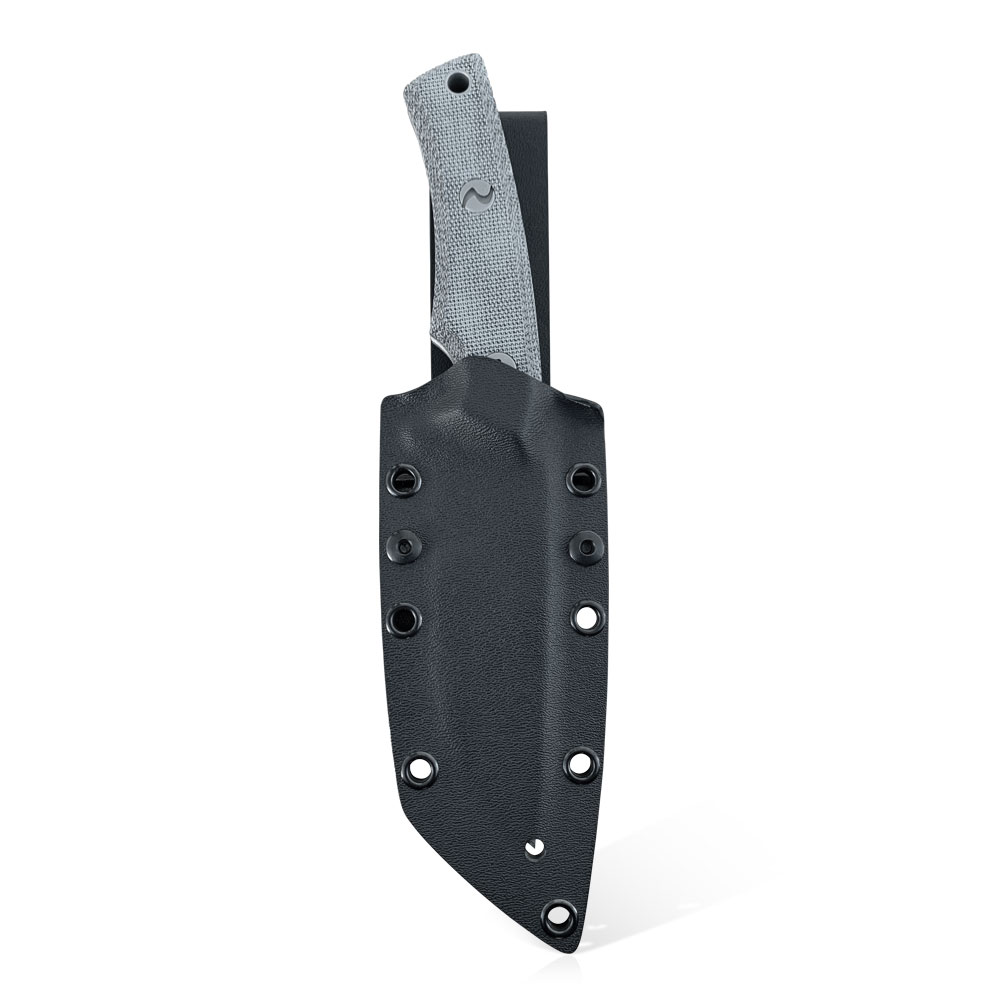 Prezentowany nóż MS Knives Infinity Black Canvas Micarta | Modestas Skirmantas zrobiony został ze stali premium: Elmax, posiada rękojeść z czarnej bawełnianej micarty (Blcack Canvas Micarta), a do jego przechowywania służy dopasowana kabura kydex.
