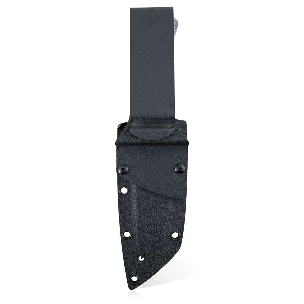 Nóż Infinity wyposażony został w czarną kaburę kydex służącą do jego przenoszenia i przechowywania.  Kydex cechuje się wysoką odpornością na uderzenia, zarysowania, charakteryzuje się niską chłonnością wilgoci, odpornością na różnorodne warunki atmosferyczne oraz wiele środków chemicznych. Kabury z niego wykonane użytkujemy wygodnie i długotrwale. Kabura mocowana jest do paska za pomocą pionowej klamry z kydexu. Kabura noża zaopatrzona została w piny przelotowe, do których można przypiąć krzesiwo (nie znajduje się w zestawie) lub inny element ekwipunku. Można też wykorzystać je do montażu noża np. do plecaka, elementu uprzęży czy rozwiązaniu typu Molle.NAZWA: Infinity