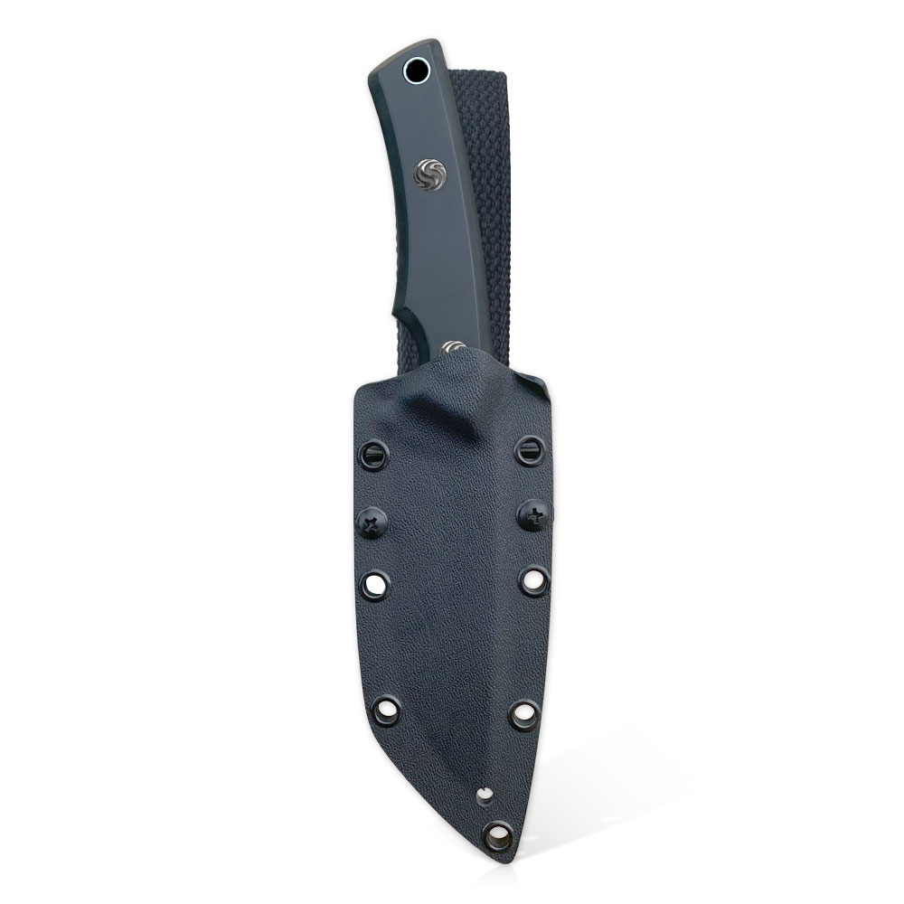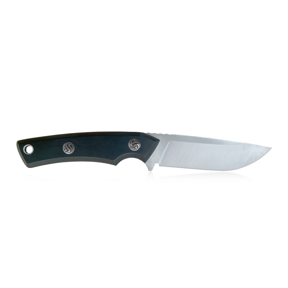Okładziny rękojeści wykonane zostały z czarnego laminatu Canvas Micarta odpornego na wilgoć, zmiany temperatury, większość rozpuszczalników i kwasów, posiadającego wysoką odporność na uszkodzenia mechaniczne. Micarta znana ze swoich doskonałych właściwości, również wizualnych (daje się stylizować na naturalny materiał) ma antypoślizgową, chropowatą strukturę. Okładziny zostały przyklejone i przykręcone wypiaskowanymi nierdzewnymi śrubami. Śruby stanowią dość charakterystyczny detal noża, przez wzgląd na autorski wzór na nich się znajdujący.