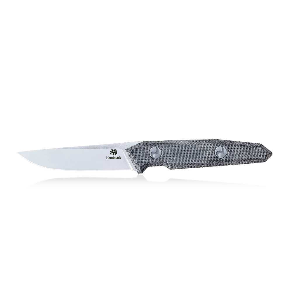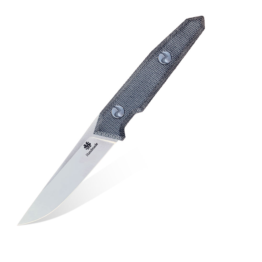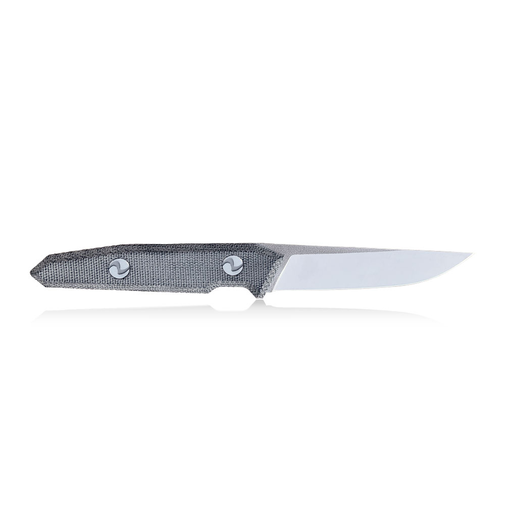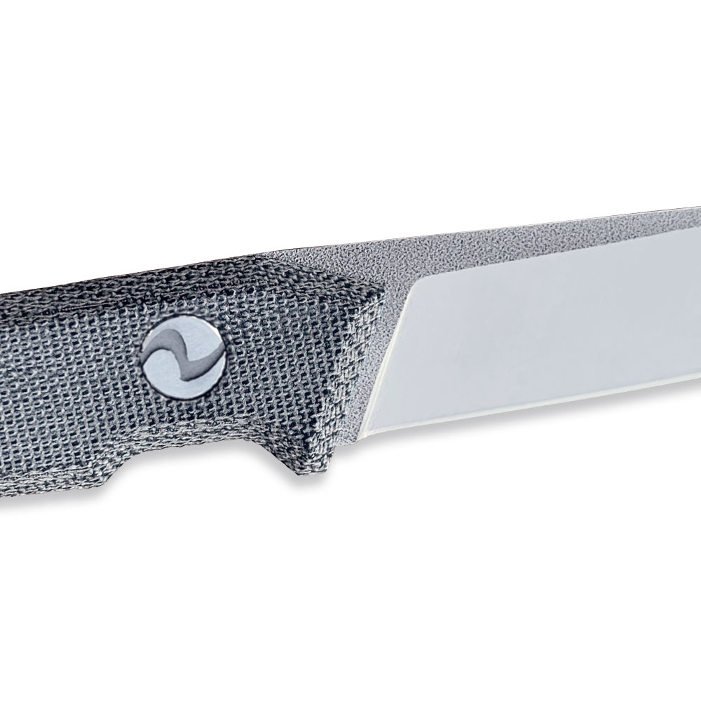 Okładziny rękojeści wykonane zostały z czarnego laminatu Canvas Micarta odpornego na wilgoć, zmiany temperatury, większość rozpuszczalników i kwasów, posiadającego wysoką odporność na uszkodzenia mechaniczne. Micarta znana ze swoich doskonałych właściwości, również wizualnych (daje się stylizować na naturalny materiał) ma antypoślizgową, chropowatą strukturę. Okładziny zostały przyklejone i przykręcone nierdzewnymi śrubami w odcieniu polerowanej stali. Śruby stanowią dość charakterystyczny detal noża, przez wzgląd na autorski wzór na nich się znajdujący. Odnosząc się do designu rękojeści zauważamy, charakterystyczny, „kanciasty” design. Płaszczyzny okładek nie są zaokrąglone. Już na pierwszy rzut oka w owalu całej rączki zauważamy zarysy kątów. Dodają one całości projektu dynamicznego i ciekawego charakteru, a co najważniejsze są wyprofilowane w sposób nieprzeszkadzający w pewności chwytu podczas operowania nożem. Jednym słowem rękojeść trzyma się równie dobrze jak bardziej tradycyjne kształty.