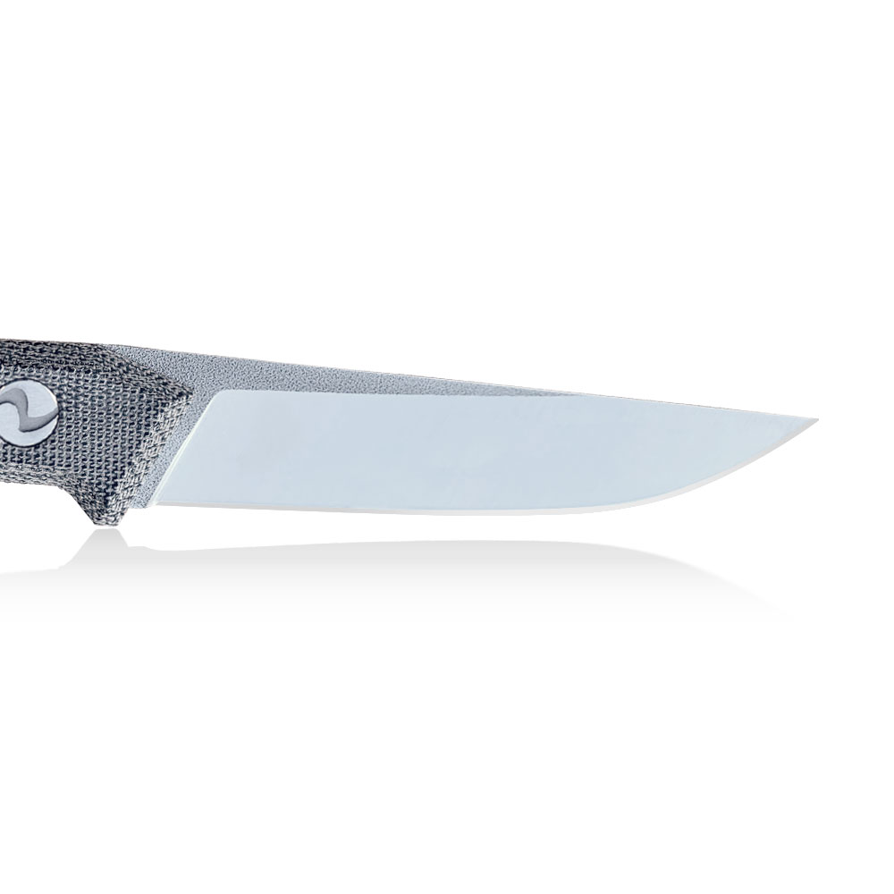 Ostrze o grzbiecie grubości 4 mm wykonane w stylu straight back, posiadające szlif płaski, zapewnia płynne cięcie i wykonywanie różnorodnych zadań (przekłuwanie, struganie, przygotowywanie posiłków itd.). Nóż nie posiada klasycznego jelca, ale jego rolę pełni podcięcie na palec, które stanowi zabezpieczenie przed zsunięciem się dłoni na krawędź tnącą podczas pracy i poprawia pewność chwytu.
