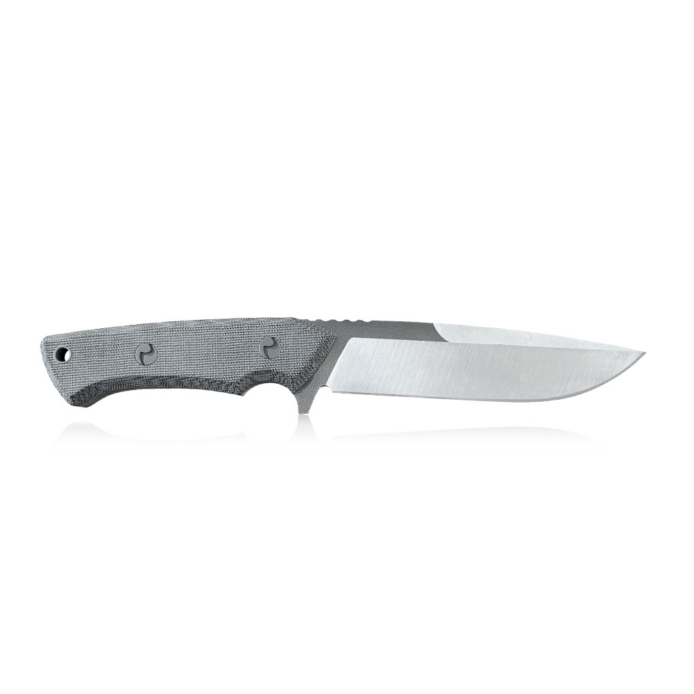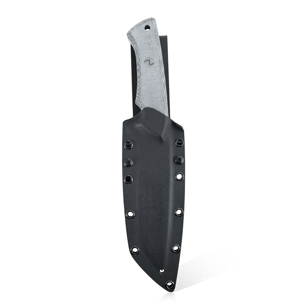 Okładziny rękojeści wykonane zostały z czarnego laminatu Canvas Micarta odpornego na wilgoć, zmiany temperatury, większość rozpuszczalników i kwasów, posiadającego wysoką odporność na uszkodzenia mechaniczne. Micarta znana ze swoich doskonałych właściwości, również wizualnych (daje się stylizować na naturalny materiał) ma antypoślizgową, chropowatą strukturę. Okładziny zostały przyklejone i przykręcone wypiaskowanymi nierdzewnymi śrubami. Śruby stanowią dość charakterystyczny detal noża, przez wzgląd na autorski wzór na nich się znajdujący.