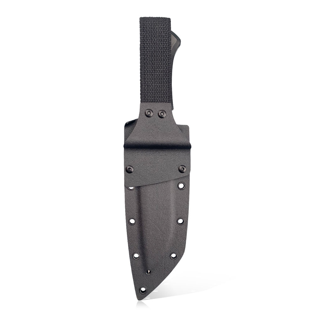 Nóż Shark wyposażony został w czarną kaburę kydex służącą do jego przenoszenia i przechowywania. Kydex cechuje się wysoką odpornością na uderzenia, zarysowania, charakteryzuje się niską chłonnością wilgoci, odpornością na różnorodne warunki atmosferyczne oraz wiele środków chemicznych. Kabury z niego wykonane użytkujemy wygodnie i długotrwale. Kabura mocowana jest do paska za pomocą parcianej szlufki. Kabura noża zaopatrzona została w piny przelotowe, do których można przypiąć krzesiwo (nie znajduje się w zestawie) lub inny element ekwipunku. Można też wykorzystać je do montażu noża np. do plecaka, elementu uprzęży czy rozwiązaniu typu Molle.NAZWA: Shark