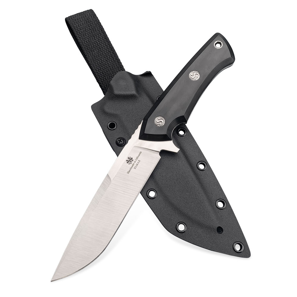 Nóż MS Knives Shark Black Paper Micarta | Modestas Skirmantas zrobiony został ze stali premium: Elmax, posiada rękojeść z micarty, a do jego przenoszenia służy dopasowana kabura kydex.