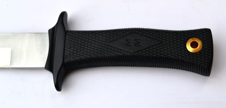 Rękojeść – moletowana okładzina z elastomeru w kolorze czarnym. Miękka rękojeść z gumy gwarantuje bardzo dobrą przyczepność, nóż nie wyślizguje się z dłoni, a mocny i pewny chwyt pozwala na wykonywanie precyzyjnych ruchów nożem mimo swoich rozmiarów. W tylnej części rękojeści znajduję się mosiężny powiększony otwór na linkę.