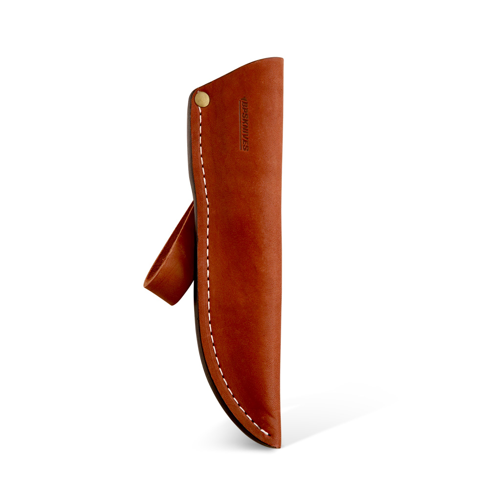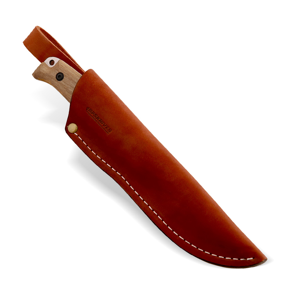 W zestawie z nożem otrzymujemy kaburę wykonaną ze skóry. Jest to klasyczne rozwiązanie pasujące stylem do narzędzia w niej się znajdującego. Drewno i skóra od zawsze stanowią idealne połączenie. Jasne przeszycia na skórze nadają jej bardzo oryginalnego wyglądu. Pochwa noża ma wysoki profil i chowa w sobie część rękojeści by lepiej zabezpieczać nóż przed wypadnięciem. Mocowana jest tradycyjnie do pasa w pozycji pionowej.