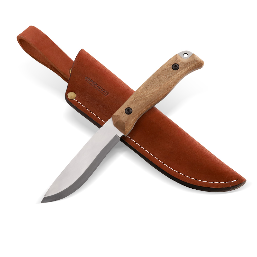 Nóż myśliwski BPS Knives HK1 Compact Hunting Stal Nierdzewna posiada roboczy profil ostrza typu drop point ze szlifem w pełni skandynawski. Ostrze ze stali nierdzewnej 5CR14MoV ma polerowane wykończenie a rękojeść wykonana została z drewna orzechowego (walnut wood). W komplecie z nożem znajduje się zdobiona przeszyciami kabura z brązowej skóry.