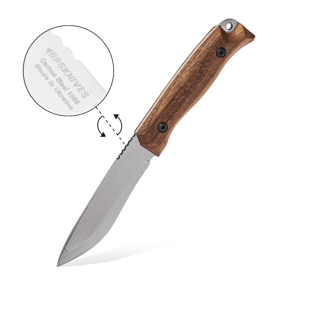 Nóż myśliwski BPS Knives HK1 Compact Hunting Stal Węglowa z krzesiwem to nóż o konstrukcji full tang, wykonany z jednego odcinka stali przebiegającego przez całą długość i szerokość rękojeści, do której przymocowano okładki z drewna.