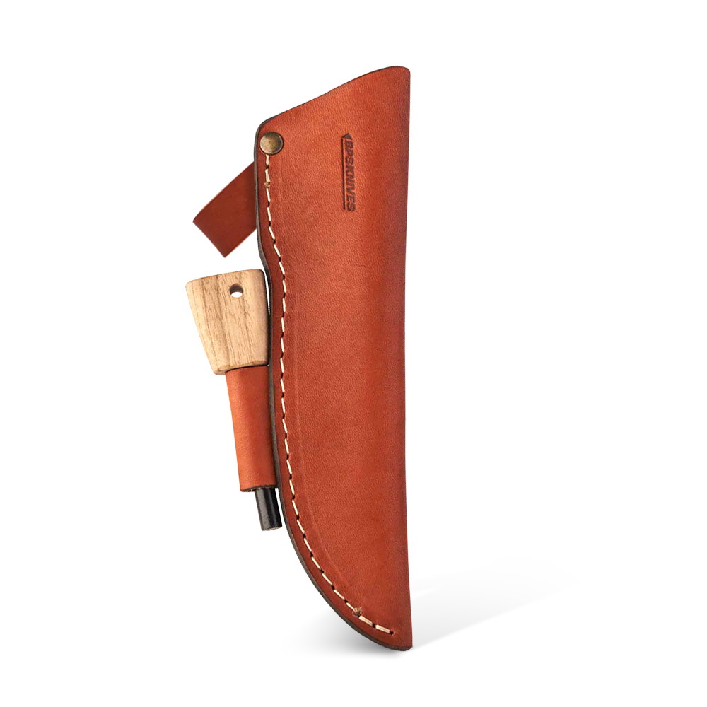 W zestawie z nożem otrzymujemy kaburę wykonaną ze skóry. Jest to klasyczne rozwiązanie pasujące stylem do narzędzia w niej się znajdującego. Drewno i skóra od zawsze stanowią idealne połączenie. Jasne przeszycia na skórze nadają jej bardzo oryginalnego wyglądu. Pochwa noża ma wysoki profil i chowa w sobie część rękojeści by lepiej zabezpieczać nóż przed wypadnięciem. Mocowana jest tradycyjnie do pasa w pozycji pionowej (tzw. Dangler). Pochwa posiada też szlufkę na krzesiwo (w zestawie).