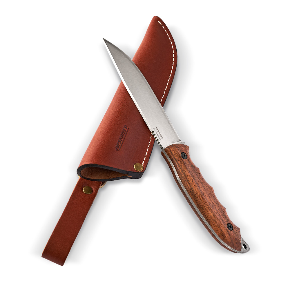Nóż myśliwski BPS Knives HK6 Hunting to nóż o konstrukcji full tang, wykonany z jednego odcinka stali przebiegającego przez całą długość i szerokość rękojeści, do której przymocowano okładki z drewna.