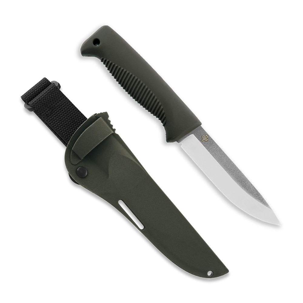 **Prezentowana wersja noża posiada ostrze ze stali nierdzewnej N690, zieloną rękojeść i pochwę kompozytową w kolorze zielonym.