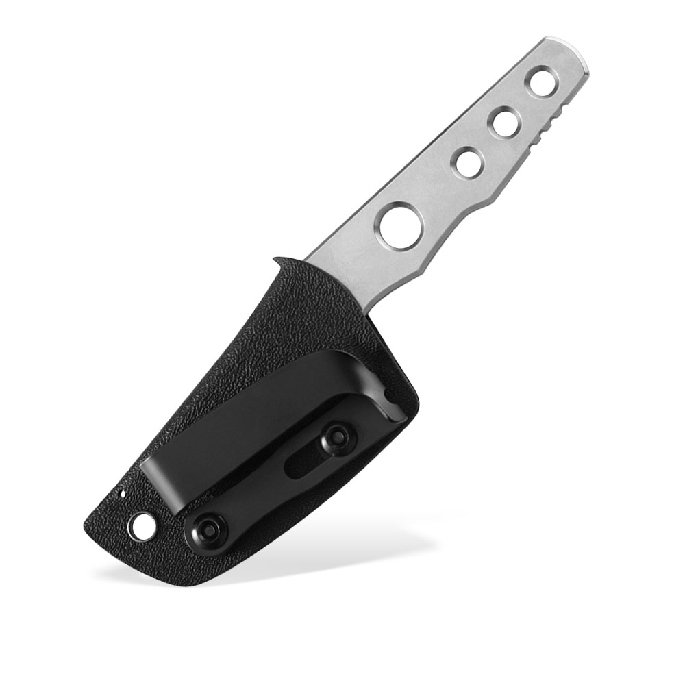 - Pokrowiec: czarna pochwa kydex ze stalowym klipsem i dodatkową klamrą typu Tek-Lok