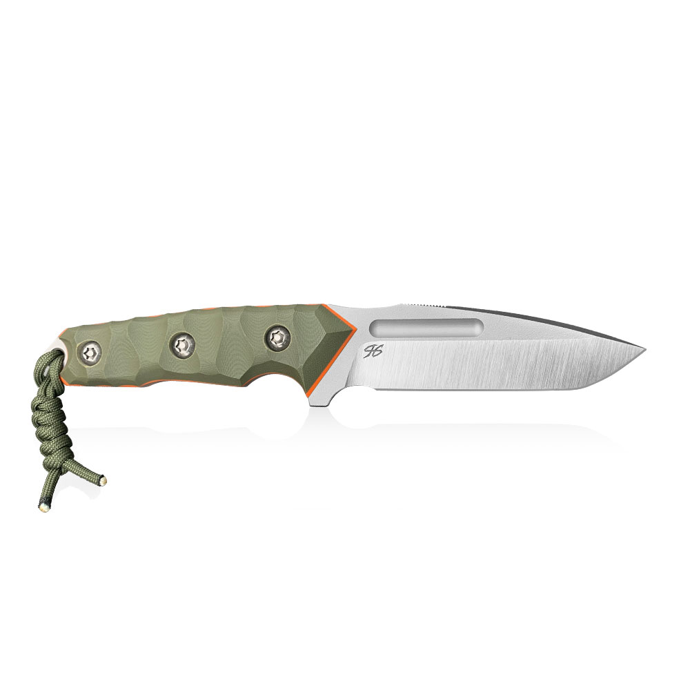 Nóż PG Knives | Piotr Gościniak Cayman | Elmax Green G10 posiada ostrze ze stali premium Elmax z dwutonowym wykończeniem (satyna na szlifie, piaskowanie na płazie). Na głowni znajdziemy charakterystyczne zbrocze (fuller). Rękojeść wykonana została z zielonego kompozytu G10 z pomarańczowymi przekładkami z tego samego materiału (spacers). Na zakończeniu rękojeści znajdziemy zbijak do szyb. W komplecie z nożem otrzymujemy kaburę z zielonego kydexu.