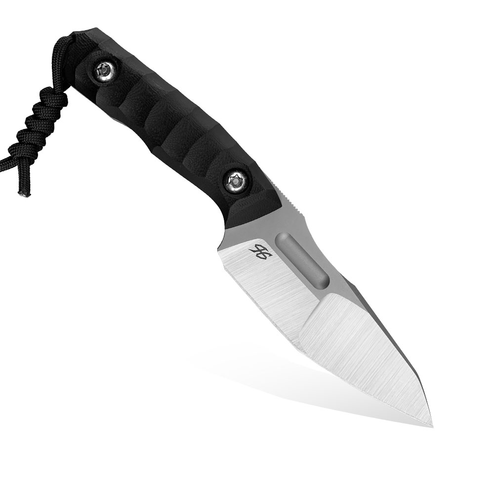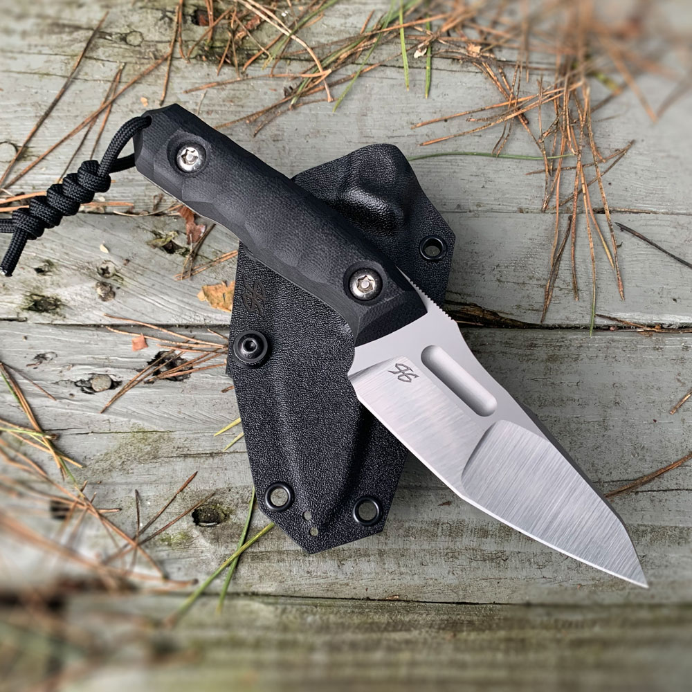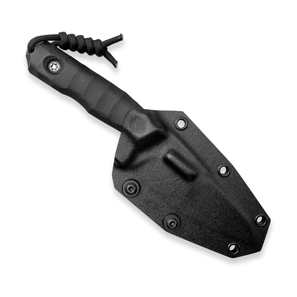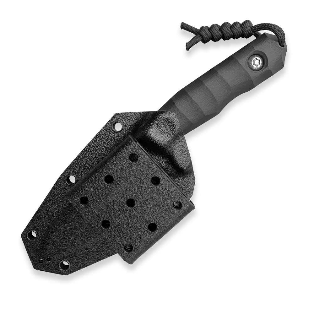 Nóż PG Knives | Piotr Gościniak Defender | Elmax Black G10 posiada ostrze ze stali premium Elmax z dwutonowym wykończeniem (satyna na szlifie, piaskowanie na płazie). Na głowni znajdziemy zbrocze (fuller). Rękojeść wykonana została z czarnego kompozytu G10. Na zakończeniu rękojeści znajdziemy zbijak do szyb. W komplecie z nożem otrzymujemy kaburę z czarnego kydexu.