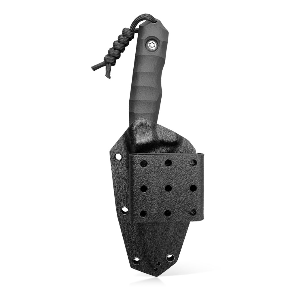 W zestawie z nożem otrzymujemy kaburę z ręcznie formowanego tworzywa kydex, którą przytwierdzamy do paska za pomocą klamry z tego samego materiału. Klamra posiada możliwość montażu w poziomie (wzdłuż paska) lub w pionie. Sam kydex to bardzo wytrzymały materiał, który cechuje się wysoką odpornością na uderzenia, zarysowania, charakteryzuje się niską chłonnością wilgoci, odpornością na różnorodne warunki atmosferyczne oraz wiele środków chemicznych. Kabury z niego wykonane użytkujemy wygodnie i długotrwale. Kabura zaopatrzona została w piny przelotowe, do których można przypiąć np. uchwyt na krzesiwo (nie znajduje się w zestawie) lub użyć ich do jej zamocowania na plecaku, elemencie uprzęży czy rozwiązaniu typu molle.NAZWA: Defender