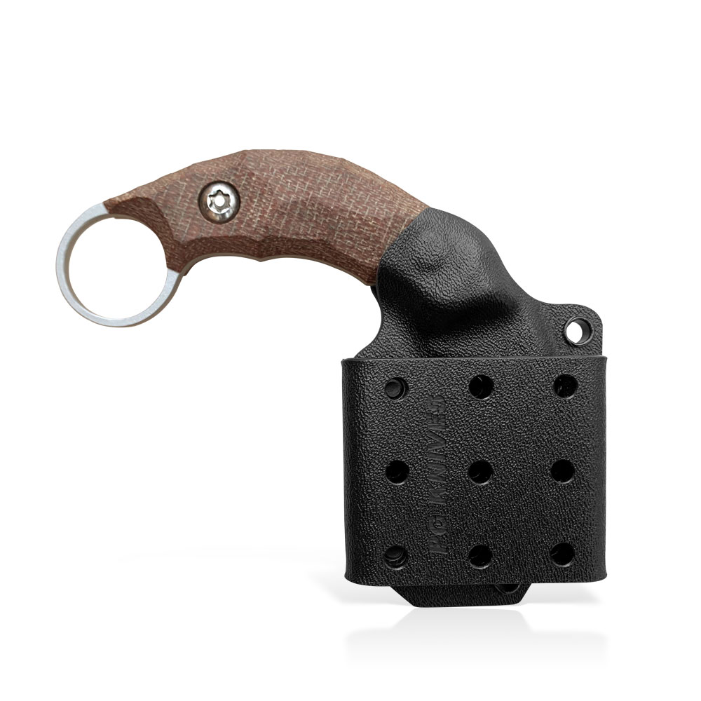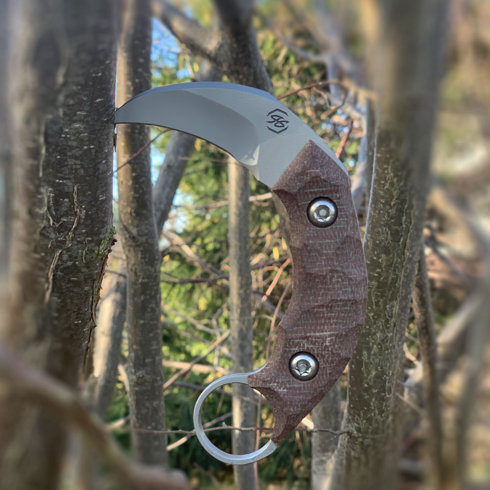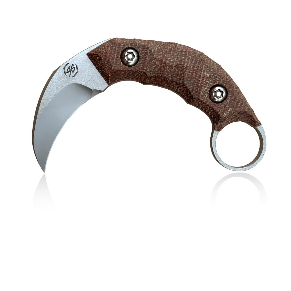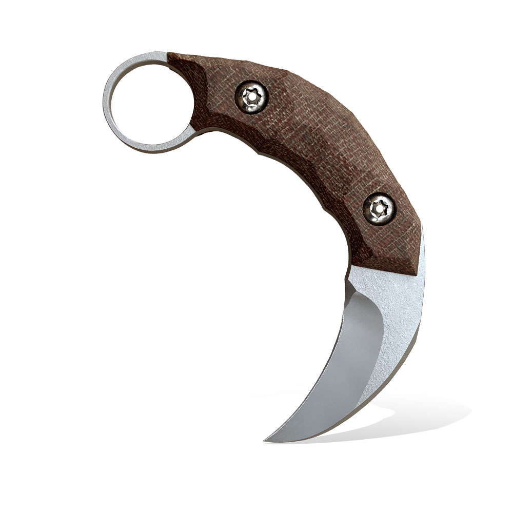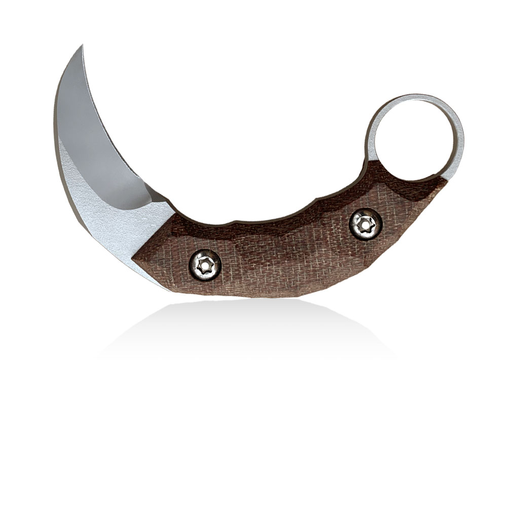 Nóż PG Knives | Piotr Gościniak Kiwi Karambit | Elmax Brown Micarta wzorowany jest na ostrzach powstałych w odległych czasach na terenie Malezji oraz Filipin, których kształt inspirowany był pazurami wielkich drapieżnych kotów. Charakterystyczne dla jego budowy są zakrzywione ostrze oraz odwrócona rękojeść z otworem na palec wskazujący.