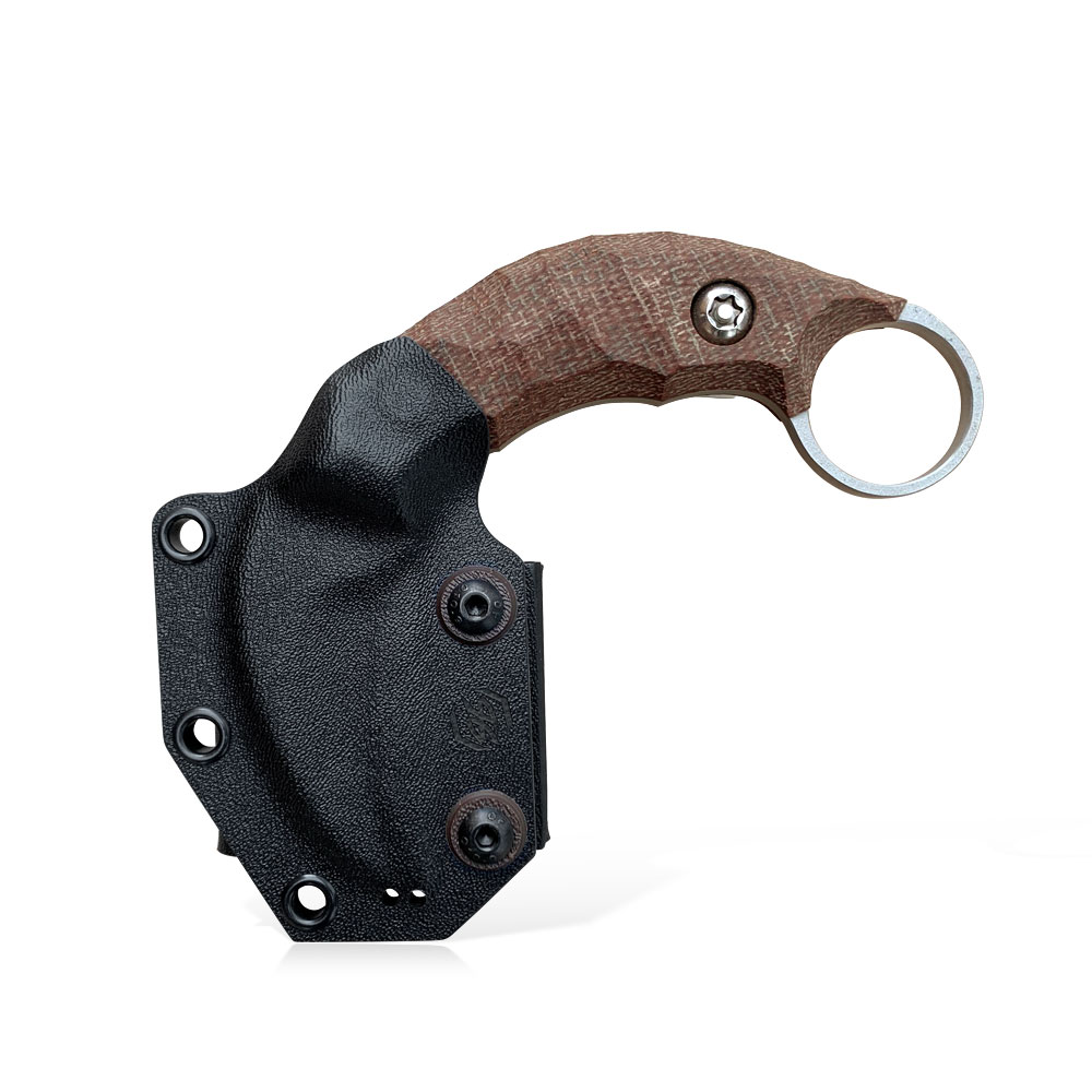 Nóż PG Knives | Piotr Gościniak Kiwi Karambit | Elmax Brown Micarta posiada ostrze ze stali premium Elmax z dwutonowym wykończeniem (satyna na szlifie, piaskowanie na płazie). Rękojeść wykonana została z brązowej micarty. W komplecie z nożem otrzymujemy kaburę z czarnego kydexu.