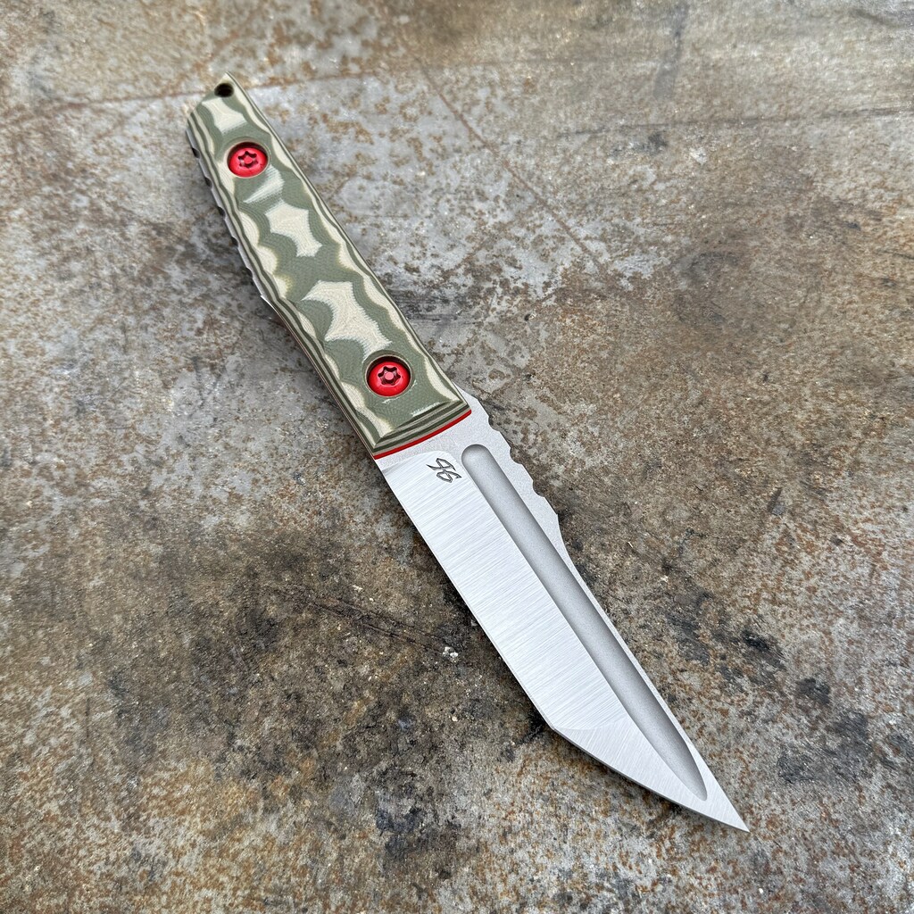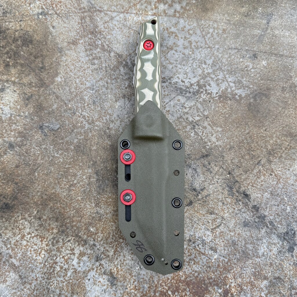 - Rękojeść: tan/olive G10 + czerwone przekładki, czerwone śruby torx