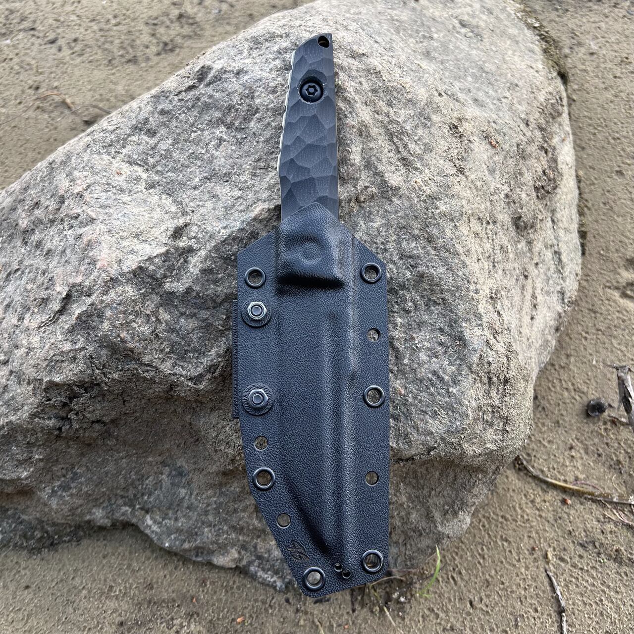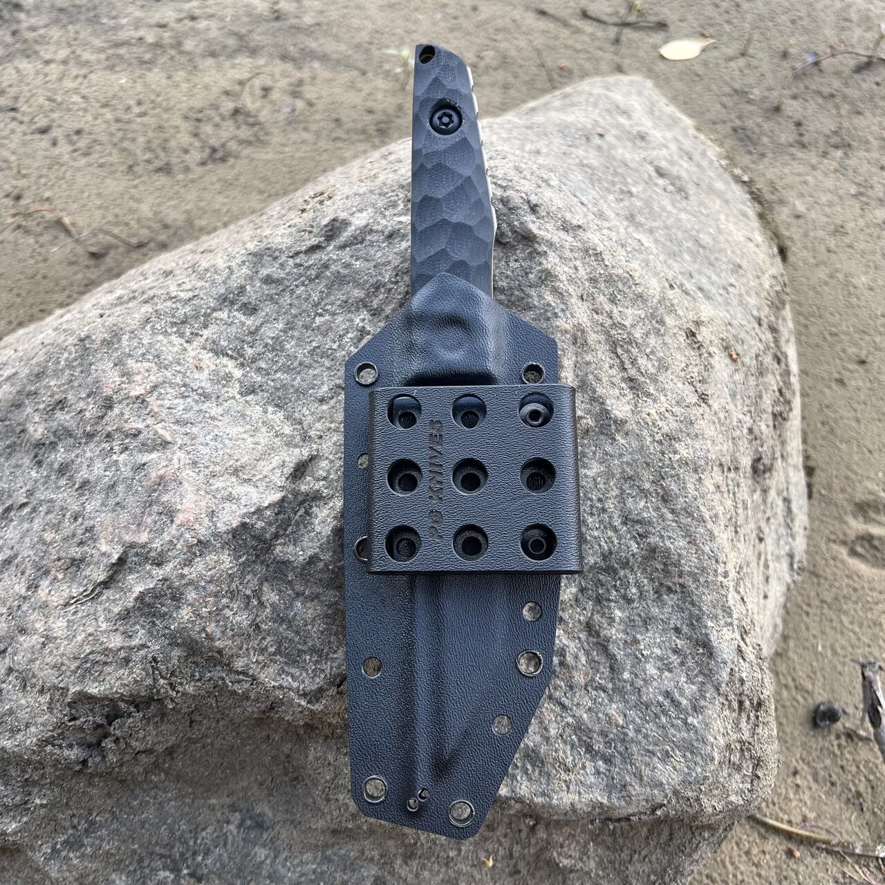 W zestawie z nożem otrzymujemy kaburę z ręcznie formowanego tworzywa Kydex, którą przytwierdzamy do paska za pomocą klamry z tego samego materiału. Klamra posiada możliwość montażu w poziomie (wzdłuż paska) lub w pionie. Sam Kydex to bardzo wytrzymały materiał, który cechuje się wysoką odpornością na uderzenia, zarysowania, charakteryzuje się niską chłonnością wilgoci, odpornością na różnorodne warunki atmosferyczne oraz wiele środków chemicznych. Kabury z niego wykonane użytkujemy wygodnie i długotrwale. Kabura zaopatrzona została w piny przelotowe, do których można przypiąć np. uchwyt na krzesiwo (nie znajduje się w zestawie) lub użyć ich do jej zamocowania na plecaku, elemencie uprzęży czy rozwiązaniu typu molle.