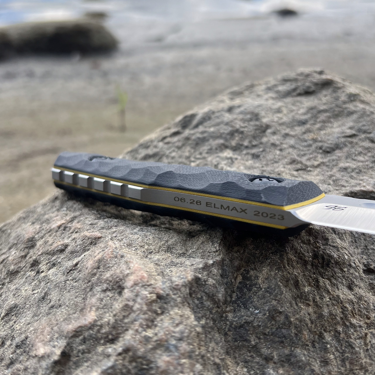 - Stal: Elmax (~60-61 HRC), wykończenie dwutonowe: satyna i piaskowanie