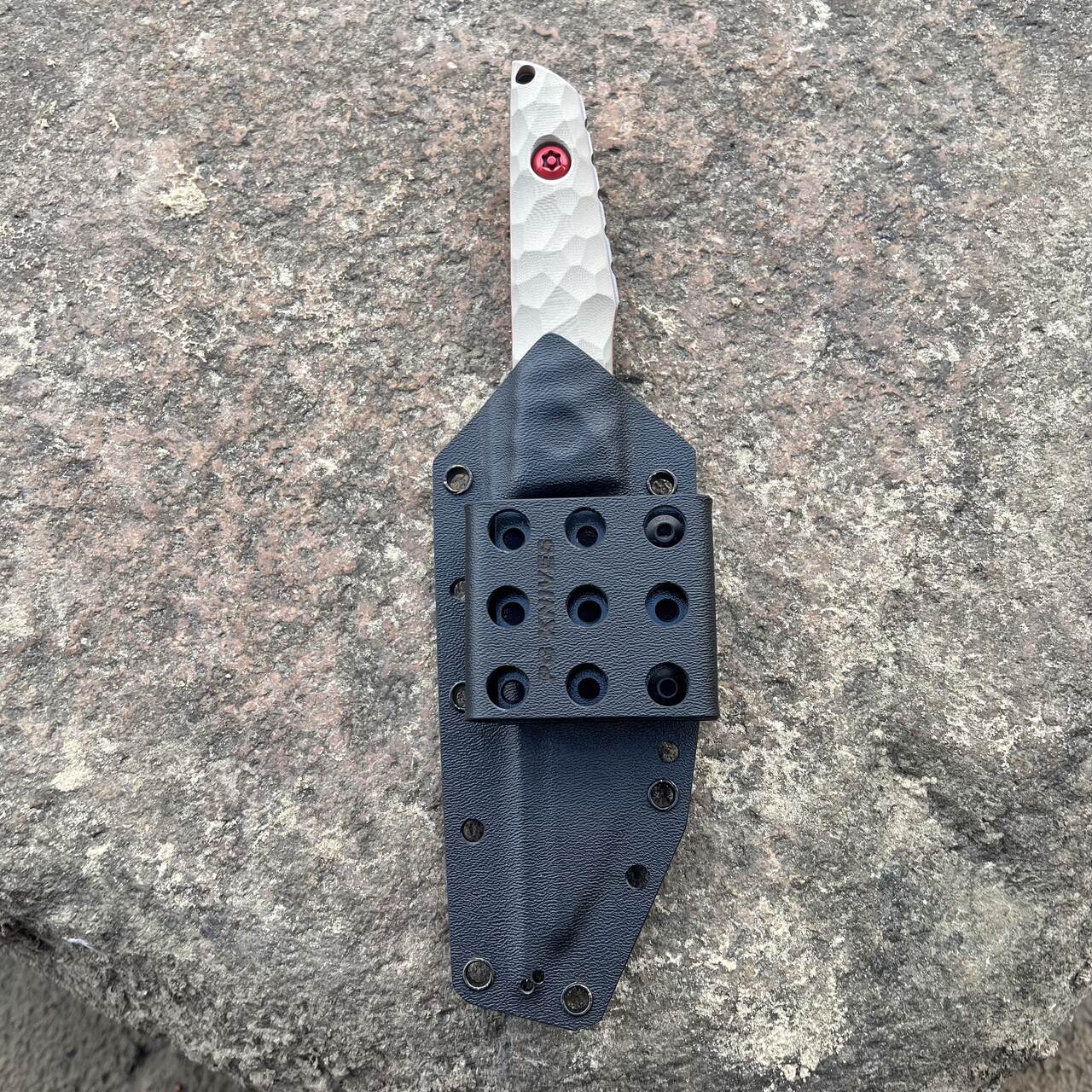 W zestawie z nożem otrzymujemy kaburę z ręcznie formowanego tworzywa Kydex, którą przytwierdzamy do paska za pomocą klamry z tego samego materiału. Klamra posiada możliwość montażu w poziomie (wzdłuż paska) lub w pionie. Sam Kydex to bardzo wytrzymały materiał, który cechuje się wysoką odpornością na uderzenia, zarysowania, charakteryzuje się niską chłonnością wilgoci, odpornością na różnorodne warunki atmosferyczne oraz wiele środków chemicznych. Kabury z niego wykonane użytkujemy wygodnie i długotrwale. Kabura zaopatrzona została w piny przelotowe, do których można przypiąć np. uchwyt na krzesiwo (nie znajduje się w zestawie) lub użyć ich do jej zamocowania na plecaku, elemencie uprzęży czy rozwiązaniu typu molle.