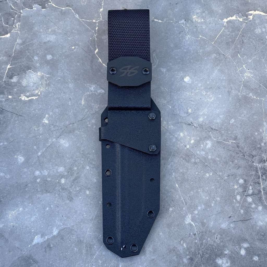 W zestawie z nożem otrzymujemy kaburę z ręcznie formowanego tworzywa Kydex, którą przytwierdzamy do paska za pomocą nylonowej szlufki na pasek. Sam Kydex to bardzo wytrzymały materiał, który cechuje się wysoką odpornością na uderzenia, zarysowania, charakteryzuje się niską chłonnością wilgoci, odpornością na różnorodne warunki atmosferyczne oraz wiele środków chemicznych. Kabury z niego wykonane użytkujemy wygodnie i długotrwale. Kabura zaopatrzona została w piny przelotowe, do których można przypiąć np. uchwyt na krzesiwo (nie znajduje się w zestawie) lub użyć ich do jej zamocowania na plecaku, elemencie uprzęży czy rozwiązaniu typu Molle.