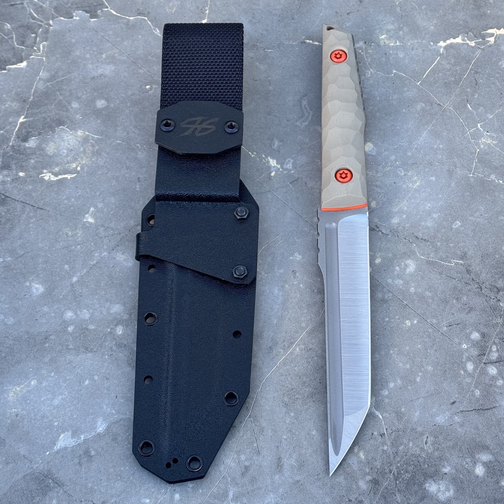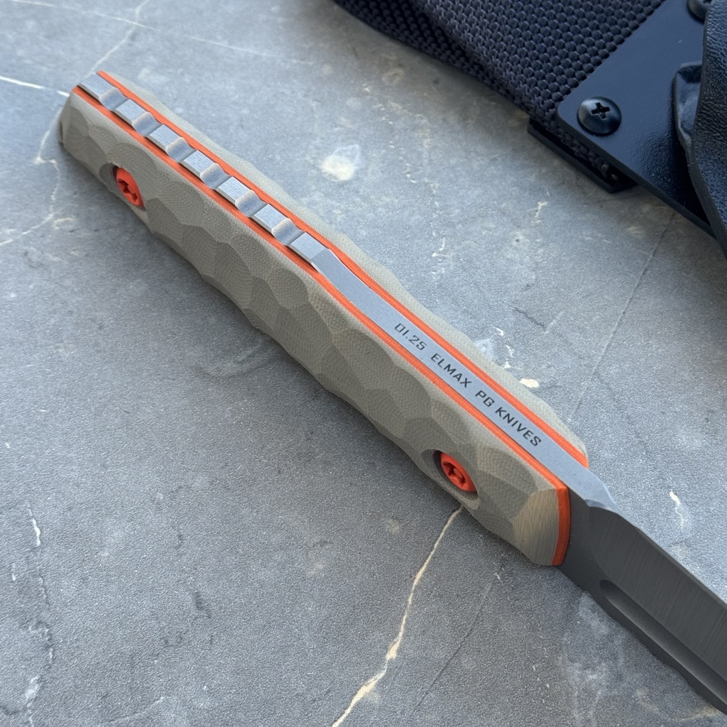 Nóż PG Knives | Piotr Gościniak Tanto 02 „Asahi” | Satin Elmax Tan G10/Orange G10 Spacers G10 Black Kydex