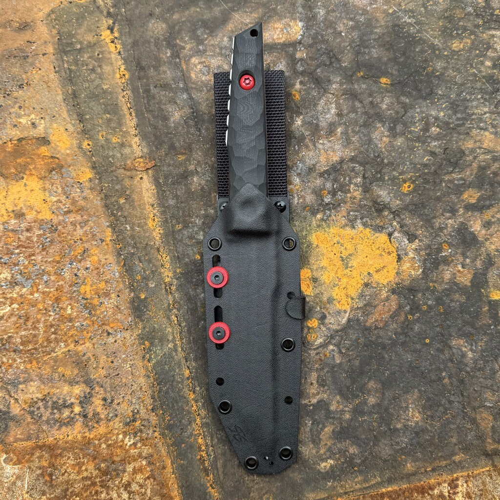 Nóż posiada ostrze ze stali premium Elmax z dwutonowym wykończeniem (satyna na szlifie, piaskowanie na płazie). Na głowni znajdziemy charakterystyczne obustronne zbrocze (fuller) a ostrze wieńczy profil tanto. Rękojeść wykonana została z kompozytu G10 w czarnym z czerwonymi przekładkami (spacers) z tego samego materiału. W komplecie z nożem otrzymujemy kaburę z Kydexu w kolorze czarnym z nylonowym uchwytem na pasek.