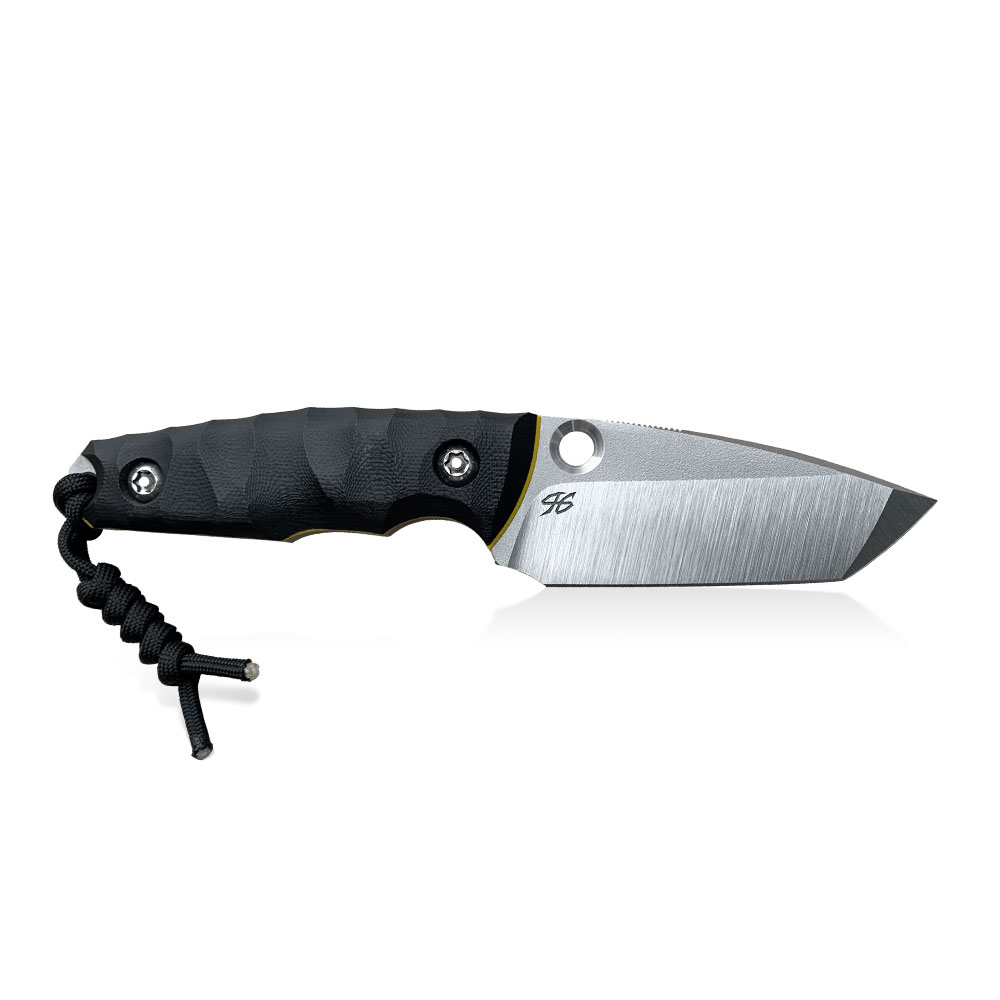 Nóż PG Knives | Piotr Gościniak Spider Tanto | Elmax Black G10 posiada ostrze ze stali premium Elmax z dwutonowym wykończeniem (satyna na szlifie, piaskowanie na płazie). Rękojeść wykonana została z czarnego kompozytu G10 z żółtymi przekładkami z tego samego materiału (spacers). W komplecie z nożem otrzymujemy kaburę z czarnego kydexu.