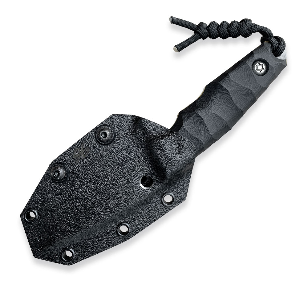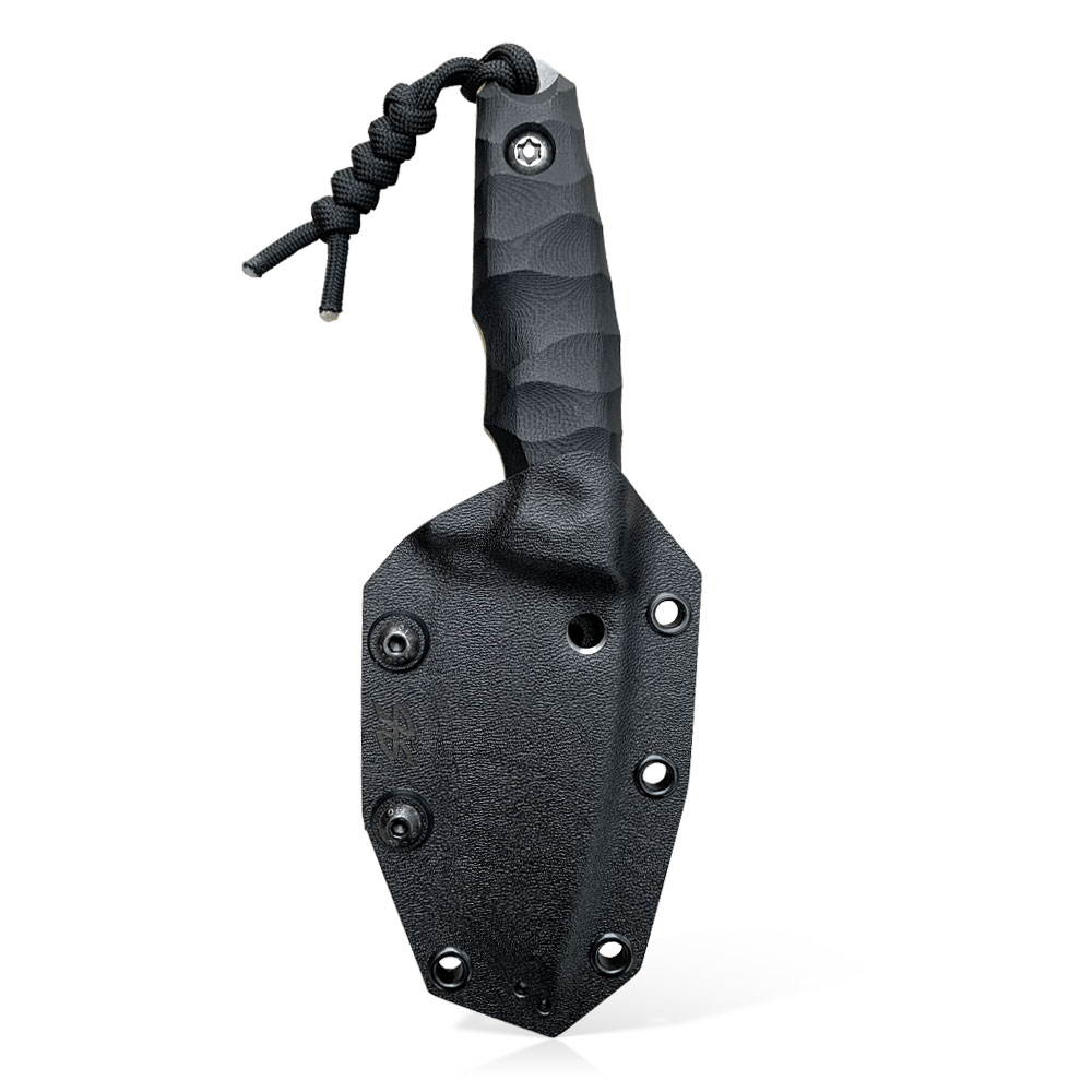 W zestawie z nożem otrzymujemy kaburę z ręcznie formowanego tworzywa kydex, którą przytwierdzamy do paska za pomocą klamry z tego samego materiału. Klamra posiada możliwość montażu w poziomie (wzdłuż paska) lub w pionie. Sam kydex to bardzo wytrzymały materiał, który cechuje się wysoką odpornością na uderzenia, zarysowania, charakteryzuje się niską chłonnością wilgoci, odpornością na różnorodne warunki atmosferyczne oraz wiele środków chemicznych. Kabury z niego wykonane użytkujemy wygodnie i długotrwale. Kabura zaopatrzona została w piny przelotowe, do których można przypiąć np. uchwyt na krzesiwo (nie znajduje się w zestawie) lub użyć ich do jej zamocowania na plecaku, elemencie uprzęży czy rozwiązaniu typu molle.NAZWA: Spider Tanto